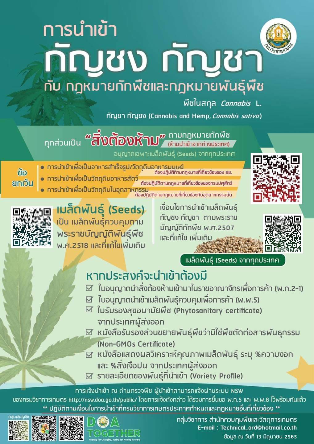 กรมวิชาการเกษตรจับมือพันธมิตรคุมเข้มการลักลอบนำเข้าทุกส่วนพืชตระกูลกัญชา ย้ำเป็นสิ่งต้องห้าม มีโทษทั้งจำและปรับ ตาม พระราชบัญญัติ กักพืช พ.ศ. 2507 และที่แก้ไขเพิ่มเติม