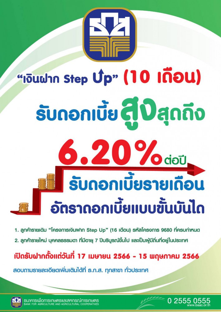 นายฉัตรชัย ศิริไล ผู้จัดการธนาคารเพื่อการเกษตรและสหกรณ์การเกษตร (ธ.ก.ส.) เปิดเผยว่า ธ.ก.ส. เปิดรับฝากเงินฝากออมทรัพย์พิเศษ “เงินฝาก Step Up” ระยะเวลารับฝาก 10 เดือน (17 เมษายน 2566 –15 กุมภาพันธ์ 2567) พร้อมรับดอกเบี้ยแบบขั้นบันได สูงสุดร้อยละ 6.20 ต่อปี เฉลี่ยร้อยละ 1.50 ต่อปี แบ่งอัตราดอกเบี้ยเป็น 3 ช่วง ได้แก่ ช่วงที่ 1 ตั้งแต่วันที่ 17 เมษายน 2566 ถึง วันที่ 15 พฤศจิกายน 2566 (ระยะเวลา 7 เดือน) ร้อยละ 0.90 ต่อปี ช่วงที่ 2 ตั้งแต่วันที่ 16 พฤศจิกายน 2566 ถึง วันที่ 15 มกราคม 2567 (ระยะเวลา 2 เดือน) ร้อยละ 1.25 ต่อปี และ ช่วงที่ 3 ตั้งแต่วันที่ 16 มกราคม 2567 ถึง วันที่ 15 กุมภาพันธ์ 2567 (ระยะเวลา 1 เดือน) ร้อยละ 6.20 ต่อปี กำหนดฝากเงินขั้นต่ำครั้งละ 50,000 บาท แต่ไม่จำกัดวงเงินรับฝากสูงสุด ทั้งนี้ ผู้ฝากที่ถอนเงินบางส่วนหรือปิดบัญชีก่อนครบกำหนด ธนาคารเรียกเก็บค่าธรรมเนียม ร้อยละ 1 ของต้นเงินที่ถอน ขั้นต่ำครั้งละ 500 บาท