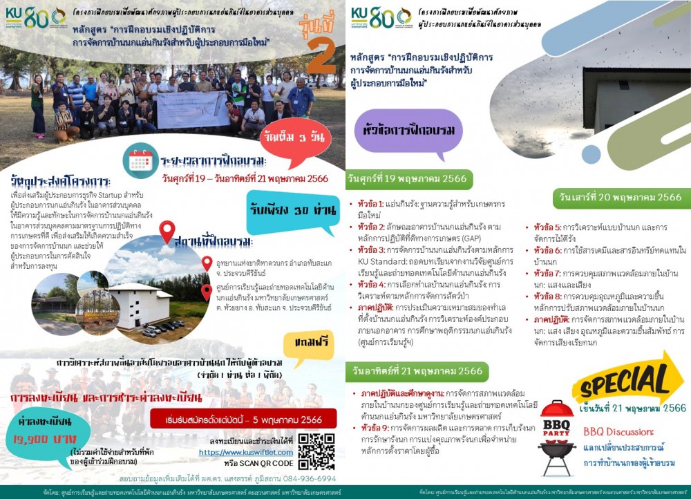 มหาวิทยาลัยเกษตรศาสตร์โดยศูนย์การเรียนรู้และถ่ายทอดเทคโนโลยีนกแอ่นกินรัง คณะวนศาสตร์ ขอเชิญผู้สนใจเข้าร่วมโครงการฝึกอบรมเพื่อพัฒนาศักยภาพผู้ประกอบการนกแอ่นกินรังในอาคารส่วนบุคคล หลักสูตร “การฝึกอบรมเชิงปฏิบัติการ การจัดการบ้านนกแอ่นกินรังสำหรับผู้ประกอบการมือใหม่” รุ่นที่ 2 ทั้งนี้เพื่อส่งเสริมผู้ประกอบการ Startup สำหรับผู้ประกอบการนกแอ่นกินรังในอาคารส่วนบุคคลให้มีความรู้ และทักษะในการจัดบ้านนกแอ่นกินรังในอาคารส่วนบุคคลให้มีมาตรฐานการปฏิบัติทางการเกษตรที่ดี เพื่อส่งเสริมให้เกิดความสำเร็จของการจัดการบ้านนกและช่วยผู้ประกอบการในการตัดสินใจสำหรับการลงทุน
