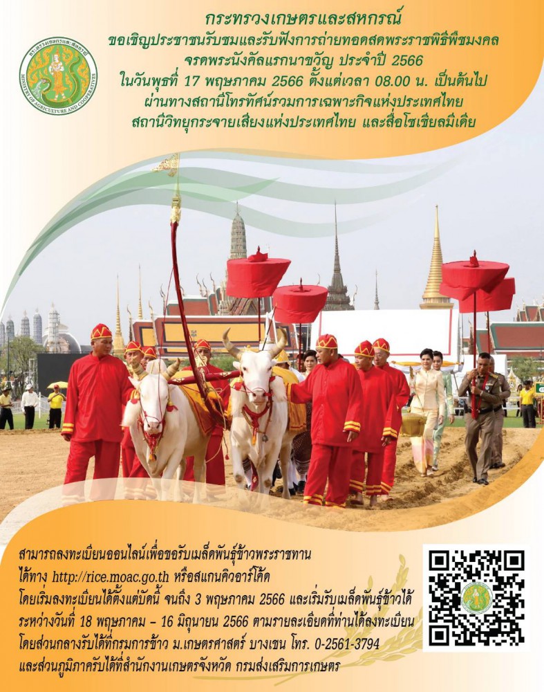 สำหรับในปี 2566 กระทรวงเกษตรและสหกรณ์ ขอเชิญประชาชนรับชมและรับฟังการถ่ายทอดสดพระราชพิธีพืชมงคลจรดพระนังคัลแรกนาขวัญ ประจำปี 2566 ในวันพุธที่ 17 พฤษภาคม 2566 ตั้งแต่เวลา 08.00 น. เป็นต้นไป ผ่านทางสถานีโทรทัศน์รวมการเฉพาะกิจแห่งประเทศไทย สถานีวิทยุกระจายเสียงแห่งประเทศไทย และสื่อโซเชียลมีเดีย รวมทั้งสามารถลงทะเบียนออนไลน์เพื่อขอรับเมล็ดพันธุ์ข้าวพระราชทาน ได้ทาง http://rice.moac.go.th หรือสแกนคิวอาร์โค้ดด้านล่าง โดยเริ่มลงทะเบียนได้ตั้งแต่บัดนี้ จนถึง 3 พฤษภาคม 2566 และเริ่มรับเมล็ดพันธุ์ข้าวได้ระหว่างวันที่ 18 พฤษภาคม – 16 มิถุนายน 2566 ตามรายละเอียดที่ท่านได้ลงทะเบียนโ ดยส่วนกลางรับได้ที่กรมการข้าว ม.เกษตรศาสตร์ บางเขน โทร. 0-2561-3794 และส่วนภูมิภาครับได้ที่สำนักงานเกษตรจังหวัด กรมส่งเสริมการเกษตร
