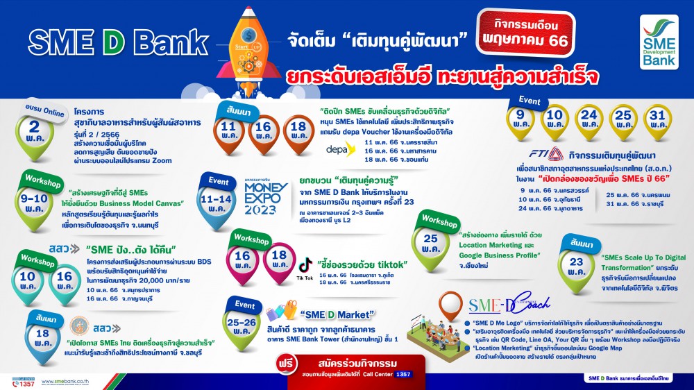 ธนาคารพัฒนาวิสาหกิจขนาดกลางและขนาดย่อมแห่งประเทศไทย (ธพว.) หรือ SME D Bank ธนาคารเพื่อเอสเอ็มอีไทย เดินหน้าภารกิจด้านการพัฒนา ส่งเสริม สนับสนุน และผลักดันผู้ประกอบการเอสเอ็มอีไทย ทั้งลูกค้าธนาคาร และไม่ใช่ลูกค้าธนาคาร เพิ่มศักยภาพธุรกิจ ช่วยเพิ่มรายได้ ลดต้นทุนค่าใช้จ่าย สร้างโอกาสเข้าถึงแหล่งทุน พาธุรกิจเติบโตสู่ความสำเร็จอย่างยั่งยืน ผ่านโปรแกรมพัฒนาต่างๆ ต่อเนื่อง ตลอดเดือนพฤษภาคม 2566 ประกอบด้วย