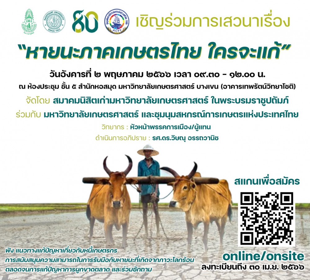 สมาคมนิสิตเก่ามหาวิทยาลัยเกษตรศาสตร์ในพระบรมราชูปถัมภ์ (ส.มก.) มหาวิทยาลัยเกษตรศาสตร์ และชุมนุมสหกรณ์การเกษตรแห่งประเทศไทย จึงขอเรียนเชิญ นิสิตเก่าทั่วประเทศ นิสิตและบุคลากรมหาวิทยาลัยเกษตรศาสตร์ สมาชิกชุมนุมสหกรณ์การเกษตรแห่งประเทศไทย ตลอดจนประชาชนผู้สนใจแนวนโยบายของพรรคการเมืองด้านการแก้ไขปัญหาการเกษตรอย่างยั่งยืน เพื่อเป็นส่วนหนึ่งในการตัดสินใจเลือกสมาชิกสภาผู้แทนราษฎรในการเข้ามาแก้ไขและพัฒนาประเทศต่อไป เข้าร่วมฟังการเสวนาได้โดยไม่เสียค่าใช้จ่ายทั้งในรูปแบบของออนไซต์ และ ออนไลน์