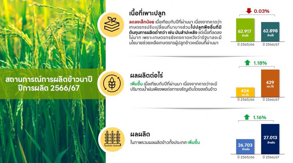 ทั้งนี้ ในปี 2566 คณะกรรมการนโยบายและบริหารข้าวแห่งชาติ (นบข.) รับทราบความต้องการใช้ข้าว (Demand) จำนวน 29.296 ล้านตันข้าวเปลือก ดังนั้น ที่ประชุมจึงมีมติเห็นชอบการกำหนดเป้าหมายการผลิตข้าว (Supply) ปีการผลิต 2566/67 จำนวน 31.632 ล้านตันข้าวเปลือก พร้อมทั้งเห็นชอบการวางแผนการผลิตข้าว ปีการผลิต 2566/67 พื้นที่ 68.622 ล้านไร่ คาดการณ์ผลผลิต 31.632 ล้านตันข้าวเปลือก แยกเป็นรอบที่ 1 (นาปี) พื้นที่ 59.480 ล้านไร่ คาดการณ์ผลผลิต 25.662 ล้านตันข้าวเปลือก