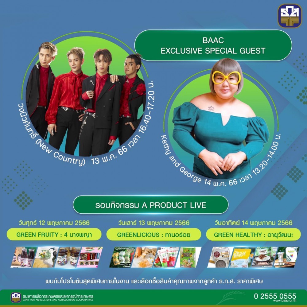 ที่สำคัญคือ กิจกรรม BAAC LIVE เสวนา Green Finance for Green Living ที่จะมีการพูดคุยในประเด็นการช่วยลดปัญหาโลกร้อนอย่างยั่งยืน ด้วยการปลูกต้นไม้ เพื่อกักเก็บคาร์บอน การสร้างมูลค่าเพิ่มให้ที่ดินและการดูแลสิ่งแวดล้อม โดยคุณปรีชา หงอกสิมมา กรรมการธนาคารต้นไม้บ้านท่าลี่ คุณเพยาว์ แสงประไพ ประธานธนาคารต้นไม้บ้านบางเสด็จ และคุณผลึก อาจหาญ ผู้อำนวยการฝ่ายพัฒนาลูกค้าและชุมชน ธ.ก.ส. กิจกรรม A-Product LIVE จำหน่ายผลิตภัณฑ์คุณภาพจากเกษตรกรลูกค้าในราคาพิเศษ อาทิ ผลิตภัณฑ์ Green Fruity set : 4 นางพญา Greenlicious set : ทานอร่อย และ Green Healthy set : อายุวัฒนะ ผ่าน Facebook page : ธกส บริการด้วยใจ และ Youtube : BAAC Thailand และมินิคอนเสิร์ตจาก วงนิวคันทรี่ (New Country)