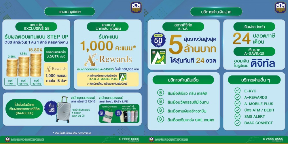 ธ.ก.ส. จัดแคมเปญ Exclusive 58 รับดอกเบี้ยเงินฝากแบบขั้นบันได สูงสุด 15.80% ต่อปี แถมคะแนน A-Rewards 1,000 คะแนน และเมื่อสมัครกรมธรรม์ ธกส เพิ่มรัก 2 12/10 และ ธกส รักคุณ Easy Life รับทันทีกระเป๋าล้อลาก หรือกระบอกน้ำเก็บความร้อน – เย็น และรับสิทธิ์ลุ้นทองคำ น้ำหนักรวมกว่า 90 บาทในแคมเปญปลูกรัก รับโชคกับกรมธรรม์เงินฝากคุ้มครองชีวิต ชวนออมเบา ๆ กับสลากดิจิทัล ออม 50 บาท ลุ้น 5 ล้านบาท พร้อมบริการสินเชื่ออัตราดอกเบี้ยพิเศษหนุนธุรกิจที่เป็นมิตรกับสิ่งแวดล้อม ทั้งสินเชื่อสีเขียว สินเชื่อนวัตกรรมดี มีเงินทุน สินเชื่อสานฝันสร้างอาชีพ การให้คำปรึกษาด้านการเงิน สินค้าคุณภาพดี A-Product และกิจกรรมเสวนาลดโลกร้อนกับกูรูธนาคารต้นไม้ที่มาให้ความรู้ด้านการกักเก็บคาร์บอนเครดิตที่ได้ทั้งเงิน หลักทรัพย์ และการรักษ์โลก ที่บูธ ธ.ก.ส. ในงาน Money Expo 2023 วันที่ 11 – 14 พฤษภาคมนี้ ณ อาคารชาเลนเจอร์ 2 – 3 อิมแพ็ค เมืองทองธานี จังหวัดนนทบุรี