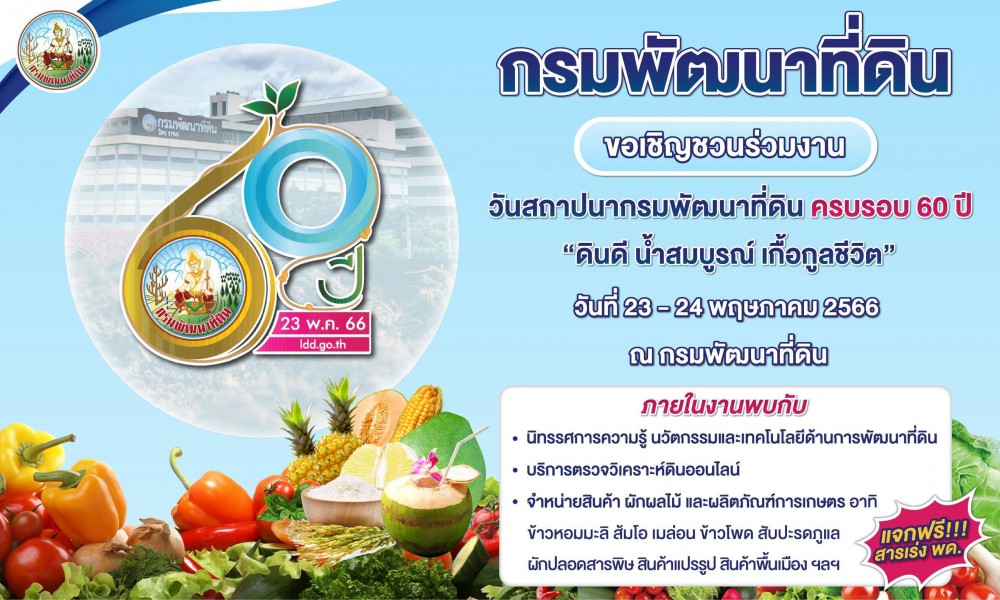 นายปราโมทย์ ยาใจ อธิบดีกรมพัฒนาที่ดิน เปิดเผยว่าวันที่ 23 พฤษภาคมของทุกปีเป็นวันสถาปนากรมพัฒนาที่ดิน ซึ่งในปีนี้กำหนดครบรอบ 60 ปี จะมีการจัดงานภายใต้หัวข้อ “ดินดี น้ำสมบูรณ์ เกื้อกูลชีวิต” มีกิจกรรมที่น่าสนใจมากมาย อาทิ พิธีมอบรางวัลเชิดชูเกียรติแก่หน่วยงานิข้าราชการและหมอดินอาสาดีเด่น นิทรรศการบริการความรู้ นวัตกรรมและเทคโนโลยีด้านการพัฒนาที่ดิน นิทรรศการวันดินโลก ปี 2566 นิทรรศการเปิดบ้าน พด. เป็นต้น นอกจากนี้ยังมีบริการต่างๆ อาทิ บริการผลิตภัณฑ์จุลินทรีย์ พด. น้ำหมักชีวภาพ การแนะนำแอปพลิเคชันของกรมพัฒนาที่ดิน จุดบริการตรวจวิเคราะห์ดินออนไลน์ พร้อมเปิดเวทีแลกเปลี่ยนความรู้ ประสบการณ์ เกี่ยวกับการบริหารจัดการดิน น้ำ ถ่ายทอดเทคโนโลยีและนวัตกรรมที่เป็นประโยชน์และนำไปใช้ได้จริง โดยนักวิชาการ ผู้เชี่ยวชาญจากหลากหลายสาขาที่เกี่ยวข้อง พร้อมจัดแสดงงานศิลปะทำจากดิน และ ชม ช็อป ชิม กับผลิตภัณฑ์ทางการเกษตร ทั้งของกินของใช้ที่คัดสรรมาจัดแสดงและจำหน่ายจากภูมิภาคต่างๆ ทั่วประเทศ