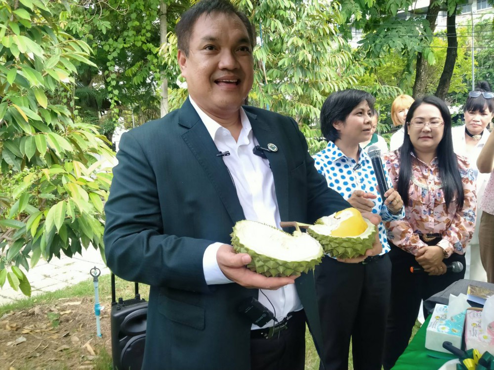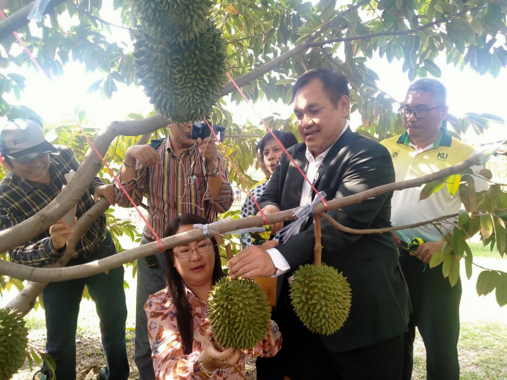 ด้าน รศ.ดร.พัชรี กล่าวว่าเริ่มปลูกทุเรียนในมหาวิทยาลัยเกษตรฯ เมื่อ ปี 2560 ทั้งหมด 13 ต้นจำนวน 9 สายพันธุุ์ ประกอบด้วย ชะนี หมอนทอง สาลิกา กบสุวรรณ หลงหลับแล จันทบุรี 1 จันทบุรี 4 จันทบุรี 9 และสายพันธุ์ของมาเลเซีย 2 สายพันธุ์ คือมูซังคิง หนามดำหรือโอฉี่ ปีนี้ออกผลผลิต 4 สายพันธุ์ คือกบสุวรรณ มูซังคิง หนามดำ จันทบุรี 9 จำนวน 33 ลูก