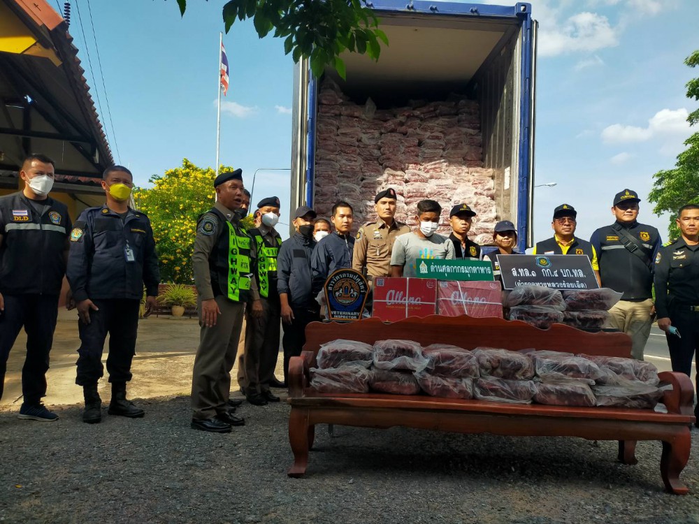 เมื่อคณะเจ้าหน้าที่ร่วมเข้าตรวจสอบภายในรถบรรทุก พบสินค้าเนื้อกระบือแช่แข็ง ยี่ห้อ Allana ซึ่งมีต้นทางจากประเทศอินเดียมากถึง 29,000 กิโลกรัม ซึ่งเป็นซากสัตว์ที่ไม่อนุญาตให้นำเข้ามาภายในราชอาณาจักร ผู้ขับรถได้แสดงเอกสารใบอนุญาตเคลื่อนย้ายสัตว์และซากสัตว์ที่ออกให้โดยสำนักงานปศุสัตว์จังหวัดมุกดาหาร เพื่อเคลื่อนย้ายจากจังหวัดมุกดาหารไปยังจังหวัดนนทบุรี เจ้าหน้าที่ด่านกักกันสัตว์มหาสารคามได้ตรวจสอบเอกสารไปยังต้นทางที่ระบุ พบว่า เป็นเอกสารที่ถูกปลอมแปลงเจ้าหน้าที่จึงแจ้งข้อกล่าวหาแก่ผู้ขับรถบรรทุก ซึ่งเป็นการกระทำความผิดตามพระราชบัญญัติโรคระบาดสัตว์ พ.ศ.2558 ดังนี้
