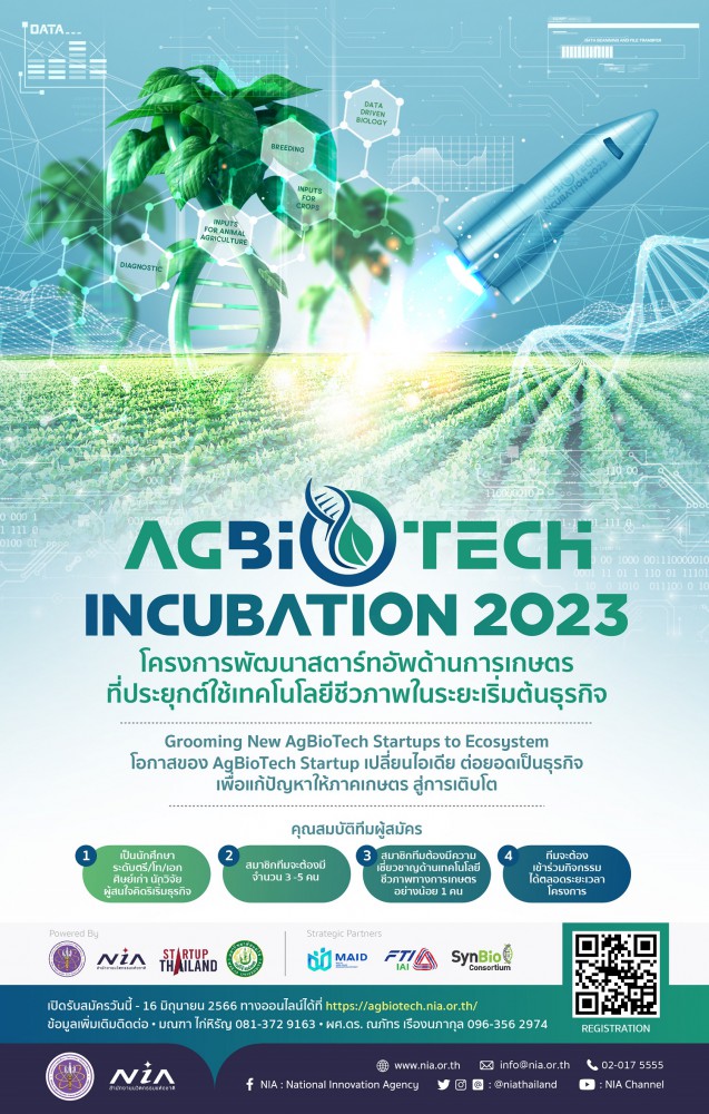 สำหรับนักศึกษา นักวิจัยภาครัฐ ศิษย์เก่าจากมหาวิทยาลัย หรือผู้ประกอบการเอสเอ็มอีที่อยากเรียนรู้เพื่อเป็น AgBioTech Startups โครงการ AgBioTech Incubation 2023 พร้อมเป็นเวทีแรกและเป็นจุดเริ่มต้นสำหรับเส้นทางการเติบโตไปด้วยกัน ผู้ที่สนใจสามารถสมัครเข้าร่วมโครงการได้ตั้งแต่วันนี้ จนถึงวันที่ 16 มิถุนายน 2566 ทาง http://agbiotech.nia.or.th/ และสอบถามรายละเอียดเพิ่มเติมได้ที่ คุณมณฑา ไก่หิรัญ เบอร์ 081-372 9163 อีเมล montha@nia.or.th และ ผศ.ดร. ณภัทร เรืองนภากุล โทร 096-356 2974 อีเมล napat_r@mju.ac.th