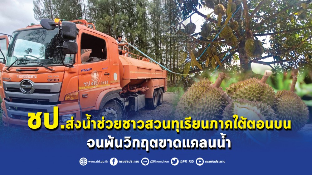 ชาวสวนทุเรียนภาคใต้ตอนบนรอดพ้นวิกฤตภัยแล้งแล้ว หลังกรมชลประทานร่วมกับหน่วยงานที่เกี่ยวข้อง เร่งส่งรถบรรทุกน้ำพร้อมเครื่องจักร เครื่องมือต่างๆ เข้าไปช่วยเหลืออย่างต่อเนื่องจนกว่าสู่ภาวะปกติ เพื่อช่วยรักษาผลผลิตทุเรียน ที่คาดว่าจะสามารถตัดออกจำหน่ายได้ในช่วงเดือนกรกฎาคมนี้