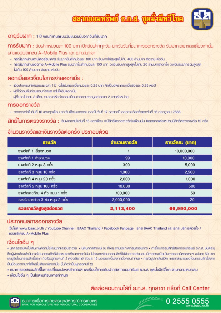 ทั้งนี้ สามารถตรวจผลการออกรางวัลและรับชมการถ่ายทอดสดการออกสลากออมทรัพย์ได้ทางเว็บไซต์ www.baac.or.th Facebook Page “ธกส BAAC Thailand” Youtube Channel “BAAC Thailand” แอปพลิเคชัน A-Mobile Plus โดยท่านที่สนใจสามารถติดต่อสอบถามรายละเอียดเพิ่มเติมเกี่ยวกับสลากออมทรัพย์ได้ที่ ธ.ก.ส. ทุกสาขา ทั่วประเทศ หรือ Call Center 02 555 0555