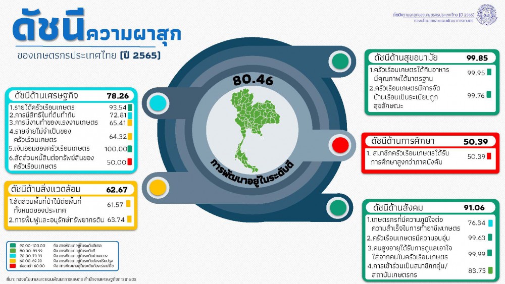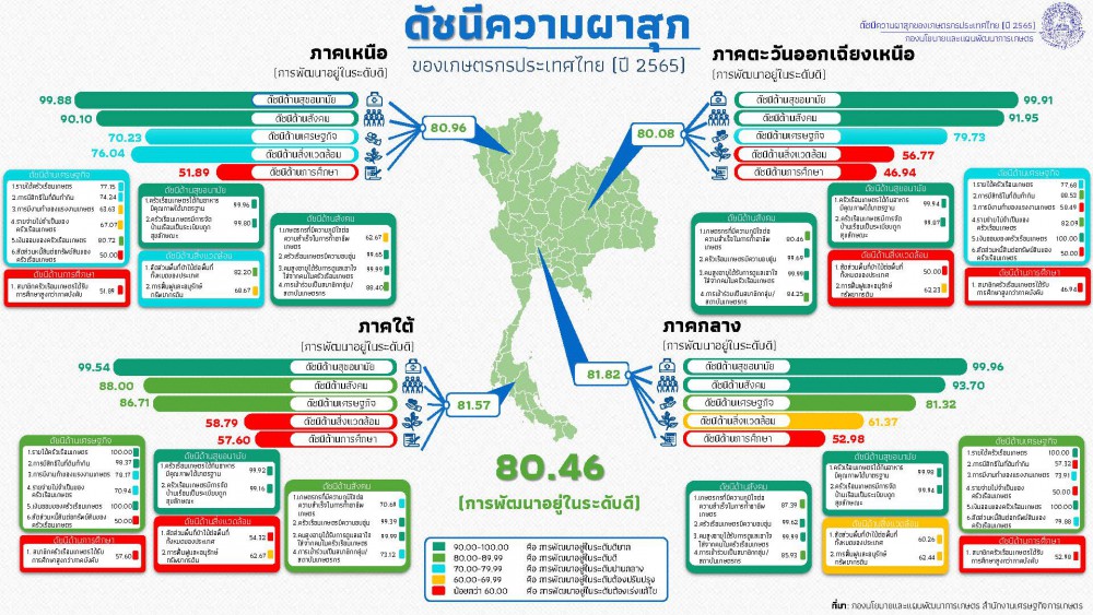 สำหรับดัชนีความผาสุกของเกษตรกรระดับประเทศ ในปี 2565 มีค่าอยู่ที่ระดับ 80.46 เป็นการพัฒนาอยู่ในระดับดี ลดลงจากปี 2564 ซึ่งมีค่าอยู่ที่ระดับ 81.10 และเมื่อพิจารณาดัชนีความผาสุกของเกษตรกรในแต่ละภูมิภาค ในปี 2565 พบว่า ภาคกลางมีค่าดัชนีมากที่สุดอยู่ที่ระดับ 81.82 รองลงมา ได้แก่ ภาคใต้อยู่ที่ระดับ 81.57 ภาคเหนืออยู่ที่ระดับ 80.96 และภาคตะวันออกเฉียงเหนืออยู่ที่ระดับ 80.08 ซึ่งทุกภาคมีการพัฒนาอยู่ในระดับดี โดยมีรายละเอียดในแต่ละด้าน ดังนี้