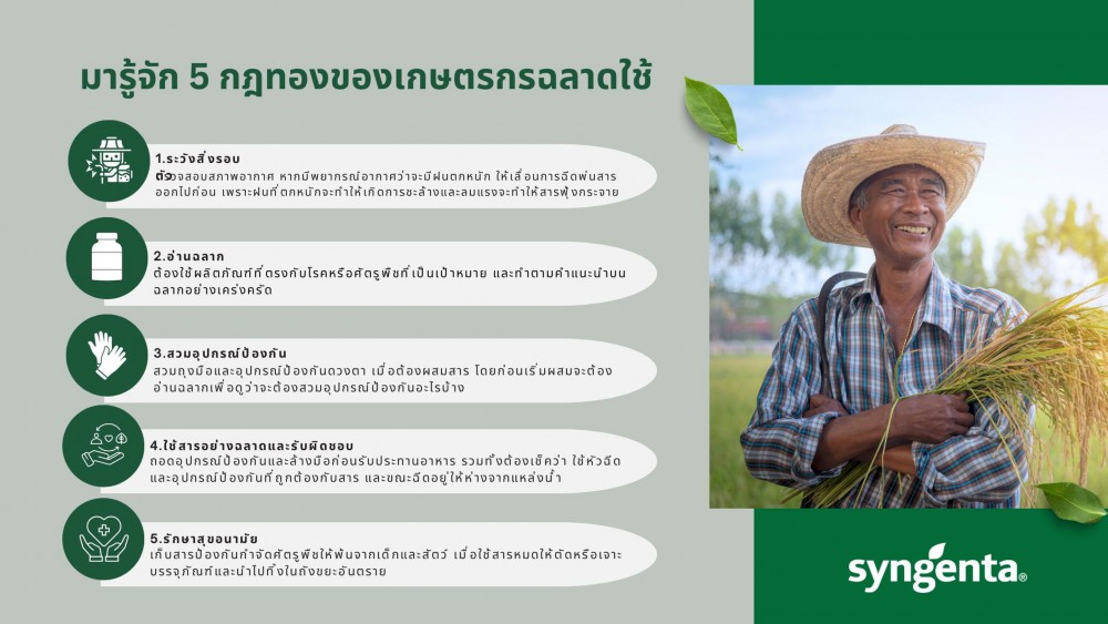 ล่าสุดได้เผยแพร่ความรู้ 4 เรื่อง ในรูปแบบคลิปวีดีโอ ซึ่งจะเป็นประโยชน์กับเกษตรกรและผู้สนใจในเรื่องการใช้สารเคมีอย่างถูกต้อง รวมทั้งการรักษาสิ่งแวดล้อม โดยมีเนื้อหา 1. 5 กฎทองของเกษตรกรฉลาดใช้ การใช้สารเคมีเกษตรอย่างมีประสิทธิภาพ และปลอดภัย ซึ่งซินเจนทา ทุ่มเทเพื่อให้ความรู้แก่เกษตรกรเกี่ยวกับวิธีการใช้สารเคมีทางการเกษตรอย่างมีประสิทธิภาพ ถูกต้องและปลอดภัยลดความเสี่ยงด้านสุขภาพและสิ่งแวดล้อมที่อาจเกิดขึ้น ถึงแม้สารเคมีป้องกันและกำจัดศัตรูพืชจะมีประโยชน์ในการช่วยดูแลและเพิ่มผลผลิต เพิ่มรายได้ให้เกษตรกร แต่หากใช้ไม่ระวังอาจทำให้เกิดผลกระทบต่อสุขภาพและสิ่งแวดล้อม ซินเจนมาจึงมีเคล็ดลับง่ายๆ 5 ข้อ โดยการระวังสิ่งรอบตัว, อ่านฉลาก, สวมอุปกรณ์ป้องกัน,ใช้สารอย่างฉลาด และ รักษาสุขอนามัย ซึ่งเกษตรกรควรจดจำเพื่อให้ใช้สารเคมีป้องกันกำจัดศัตรูพืชได้อย่างมีประสิทธิภาพและปลอดภัยสูงสุด