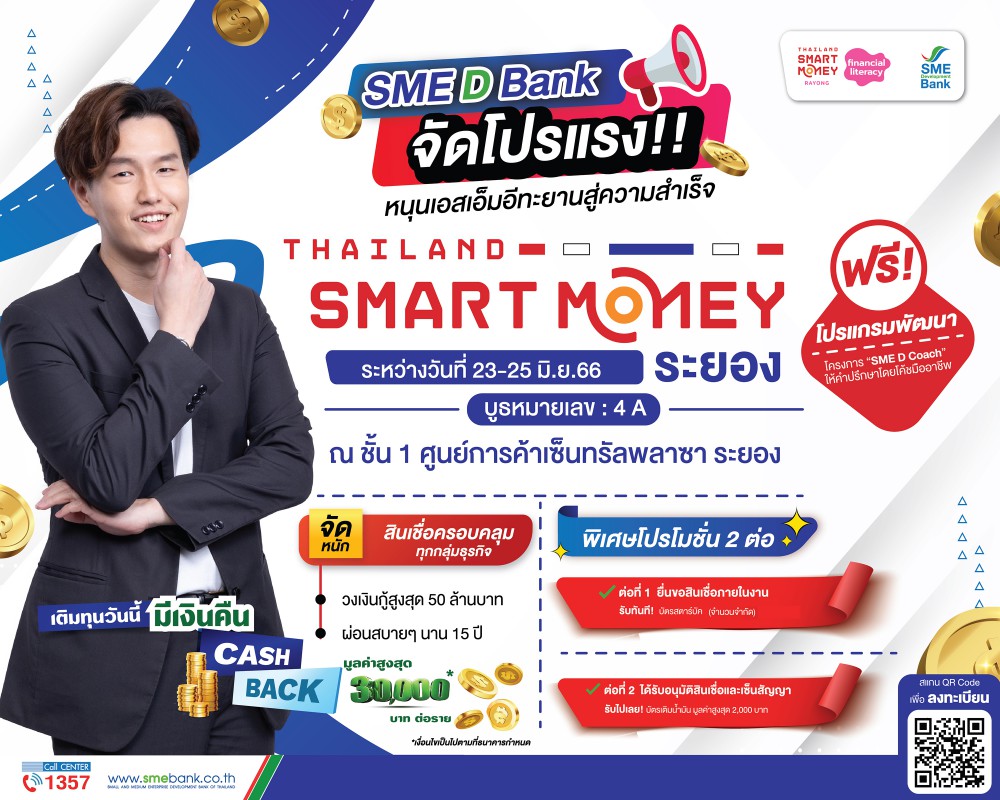 SME D Bank ยกขบวน “เติมทุนคู่พัฒนา” จัดโปรจุใจ วงเงินกู้สูงสุด 50 ล้าน ใช้วันนี้มี Cash Back 3 หมื่น ร่วมงาน Thailand Smart Money ระยอง 23-26 มิ.ย.นี้