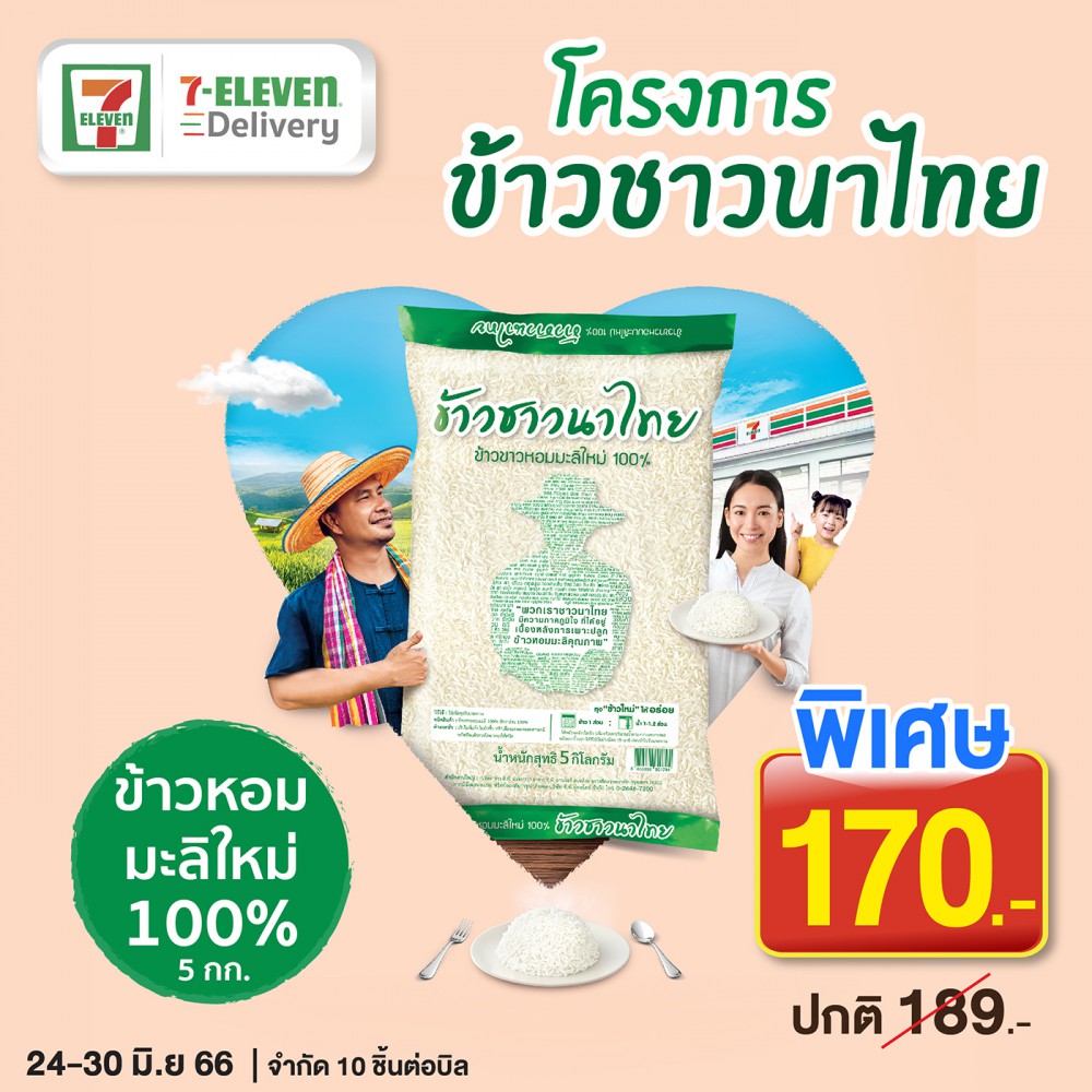“ข้าวชาวนาไทย” ข้าวหอมมะลิใหม่ 100% ขนาด 5 กก. ราคาเพื่อคนไทยพิเศษสุด 170 บาท (จากราคาปกติ 189 บาท) หาซื้อได้ที่ All Online ก็สะดวก หรือไปช้อปง่ายๆ ไม่ต้องออกจากบ้าน ก็พร้อมบริการส่งสินค้าถึงบ้ านคุณด้วย 7-Eleven Delivery ได้ตั้งแต่วันที่ 24-30 มิถุนายน 2566 คลิกลิ้งค์สั่งซื้อได้ที่ https://7eleventh.page.link/ gNeAjCuThSxnEGiD6