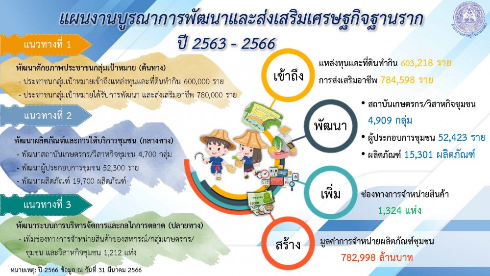 หากย้อนดูผลสำเร็จของขับเคลื่อนแผนงานบูรณาการพัฒนาและส่งเสริมเศรษฐกิจฐานราก ตั้งแต่ปีงบประมาณ 2563 – 2566 (ตุลาคม 2562 – มีนาคม 2566) สศก. พบว่า แนวทางที่ 1 พัฒนาศักยภาพประชาชนกลุ่มเป้าหมาย (ต้นทาง) มีการดำเนินการช่วยเหลือแหล่งทุนและที่ดินทำกินไปแล้ว 603,218 ราย (เป้าหมาย 600,00 ราย) ส่งเสริมอาชีพ 784,598 ราย (เป้าหมาย 780,000 ราย) แนวทางที่ 2 ยกระดับความสามารถในการดำเนินธุรกิจ (กลางทาง) ดำเนินการพัฒนาสถาบันเกษตรกร/วิสาหกิจชุมชน 4,909 กลุ่ม (เป้าหมาย 4,700 กลุ่ม) พัฒนาผู้ประกอบการชุมชน 52,423 ราย (เป้าหมาย 52,300 ราย) และพัฒนาผลิตภัณฑ์ 15,301 ผลิตภัณฑ์ (เป้าหมาย 19,700 ผลิตภัณฑ์)