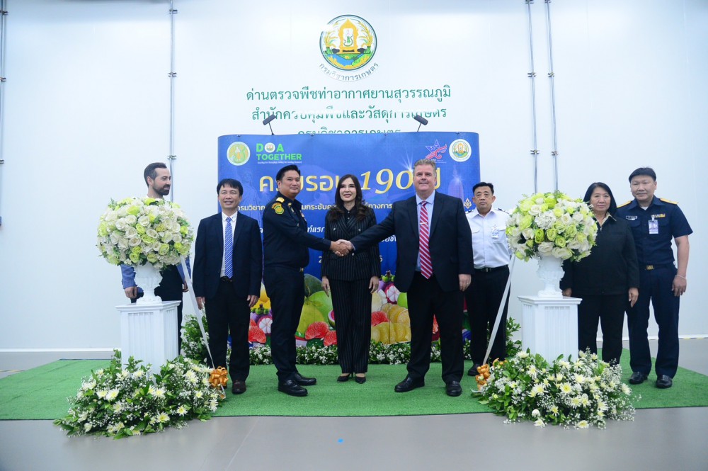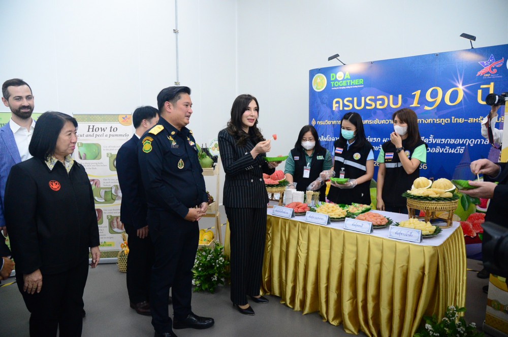 นางสาวมนัญญา ไทยเศรษฐ์ รัฐมนตรีช่วยว่าการกระทรวงเกษตรและสหกรณ์ พร้อมนาย มาร์ค กิลคีย์ (MR. Marc Gilkey) ผู้แทนกระทรวงเกษตรสหรัฐอเมริกา (USDA) ร่วมเป็นสักขีพยานการจัดส่งส้มโอไทยชิปเม้นท์แรก มะม่วงชิปเม้นท์แรกของฤดูกาลปี 2566 และมังคุด ไปยังกรุงวอชิงตัน ดีซี สหรัฐอเมริกา โดยมี นายระพีภัทร์ จันทรศรีวงศ์ อธิบดีกรมวิชาการเกษตร กล่าวรายงานสรุปการดำเนินงานโครงการ Pre Clearance Program ณ ด่านตรวจพืชท่าอากาศยานสุวรรณภูมิ อาคารตรวจสอบรับรองสินค้าพืชแบบเบ็ดเสร็จ กรมวิชาการเกษตร แห่งใหม่