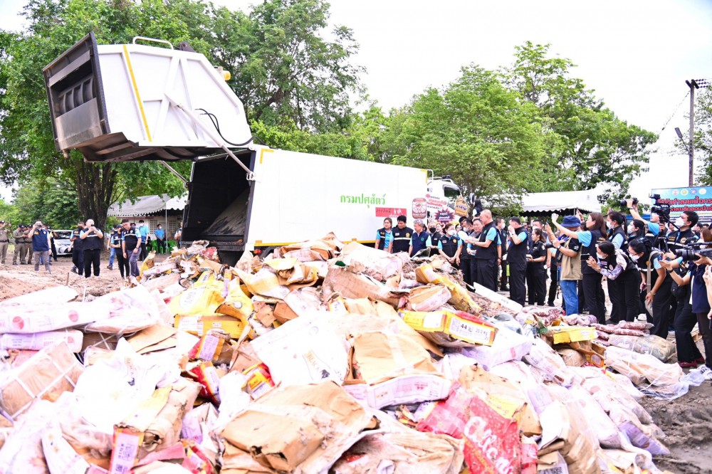 สำหรับการดำเนินการกับซากกระบือและซากโคของกลางแบ่งเป็น 2 ส่วน โดยส่วนที่หนึ่งได้ทำลายไปแล้วจำนวน 244,068 กิโลกรัม คิดเป็นมูลค่า 38.7 ล้านบาท ส่วนที่สองได้รวบรวมเพื่อทำลายในวันนี้ 110,079 กิโลกรัม คิดเป็นมูลค่า 14.5 ล้านบาท โดยแหล่งผลิตของเนื้อกระบือของกลาง ส่วนใหญ่มาจากประเทศอินเดีย