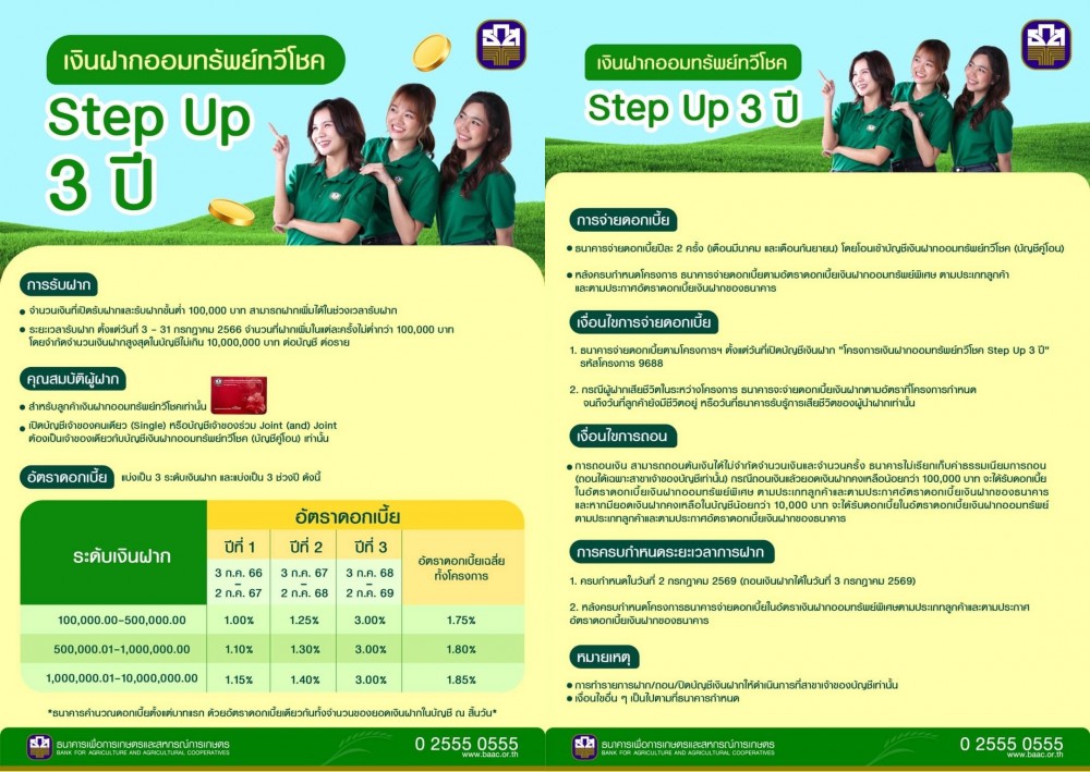ธ.ก.ส. เปิดโครงการ “เงินฝากออมทรัพย์ทวีโชค Step Up 3 ปี” ระยะเวลา 3 ปี รับดอกเบี้ยแบบขั้นบันได สูงสุด 3% ต่อปี เฉลี่ยสูงสุด 1.85% ต่อปี ฝากขั้นต่ำ 100,000 บาท วงเงินรับฝากสูงสุด 10 ล้านบาท เริ่มเปิดรับฝาก 3 – 31 กรกฎาคม 2566