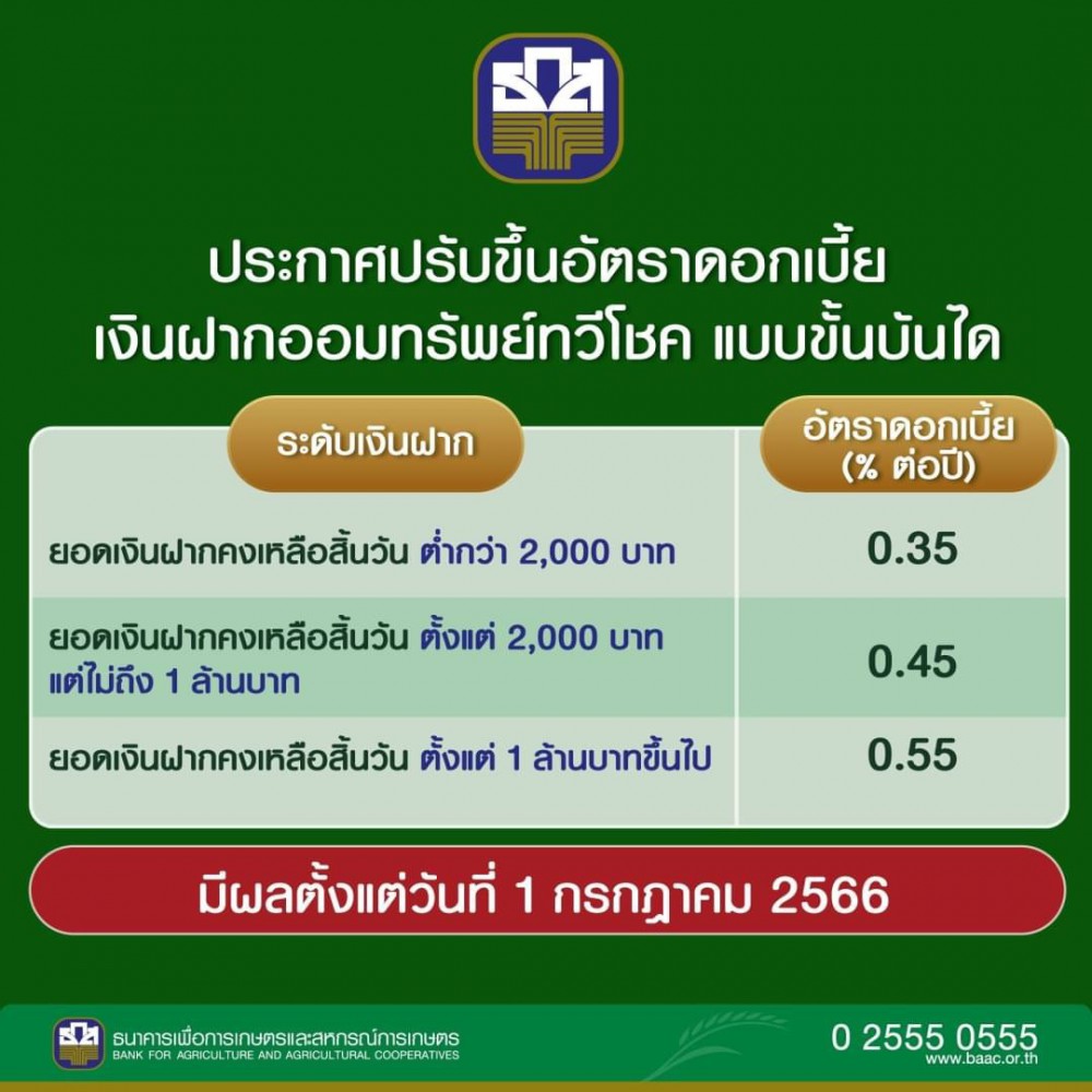 ธ.ก.ส. ประกาศปรับขึ้นอัตราดอกเบี้ยเงินฝากออมทรัพย์ทวีโชคแบบขั้นบันได ร้อยละ 0.10 ต่อปี ทุกระดับเงินฝาก เพื่อเพิ่มผลตอบแทนให้กับผู้ฝากและสนับสนุนการออมเงินอย่างต่อเนื่อง โดยมีผลตั้งแต่บัดนี้เป็นต้นไป