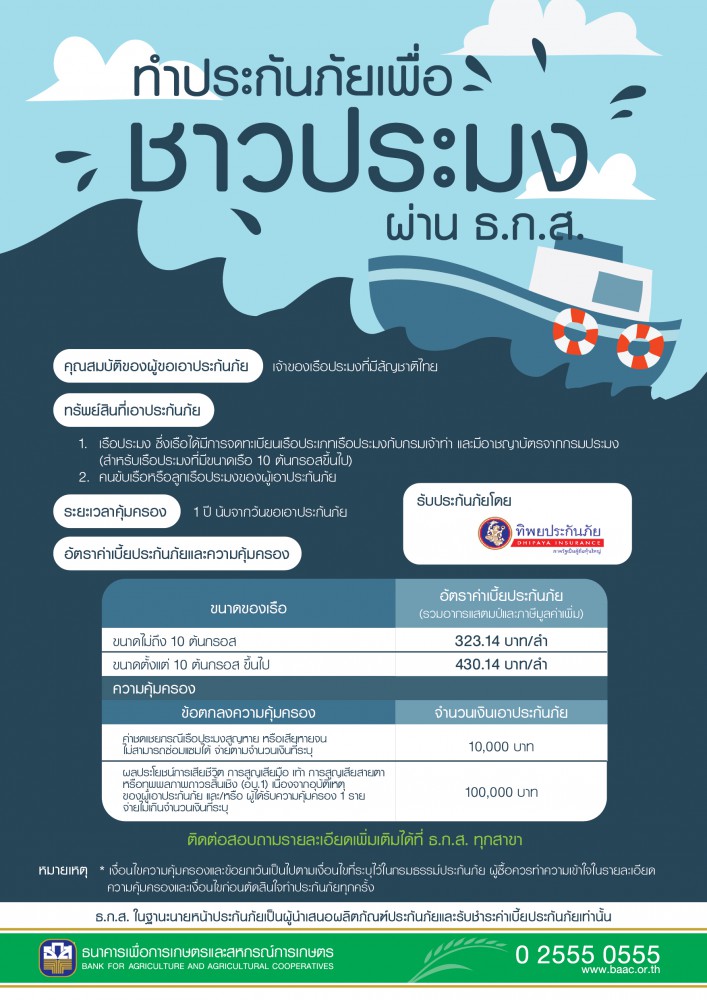 สำหรับความคุ้มครอง เมื่อเกิดภัย ประกอบด้วย ค่าชดเชยกรณีเรือประมงสูญหายหรือเสียหายจนไม่สามารถซ่อมแซมได้ อันเนื่องมาจากอุทกภัย วาตภัย พายุ คลื่นลมแรง คลื่นซัดชายฝั่ง แผ่นดินไหว และสึนามิ ในระยะเวลาเอาประกัน วงเงินไม่เกินลำละ 10,000 บาท และกรณีเสียชีวิต การสูญเสียมือ เท้า สายตา หรือทุพพลภาพถาวรสิ้นเชิง (อ.บ.1) จากอุบัติเหตุของผู้เอาประกันภัย และ/หรือ ผู้ได้รับความคุ้มครอง 1 ราย (คนขับเรือหรือลูกเรือประมงของผู้เอาประกันภัย) สูงสุดไม่เกินรายละ 100,000 บาท โดยเงื่อนไขการจ่ายค่าทดแทนเป็นไปตามที่ระบุไว้ในกรมธรรม์ สอบถามรายละเอียดเพิ่มเติมได้ที่ ธ.ก.ส. สาขาใกล้บ้านท่านหรือศูนย์บริการลูกค้า 1593 ในวันและเวลาทำการ และ Call center 02 555 0555 ตลอด 24 ชั่วโมง