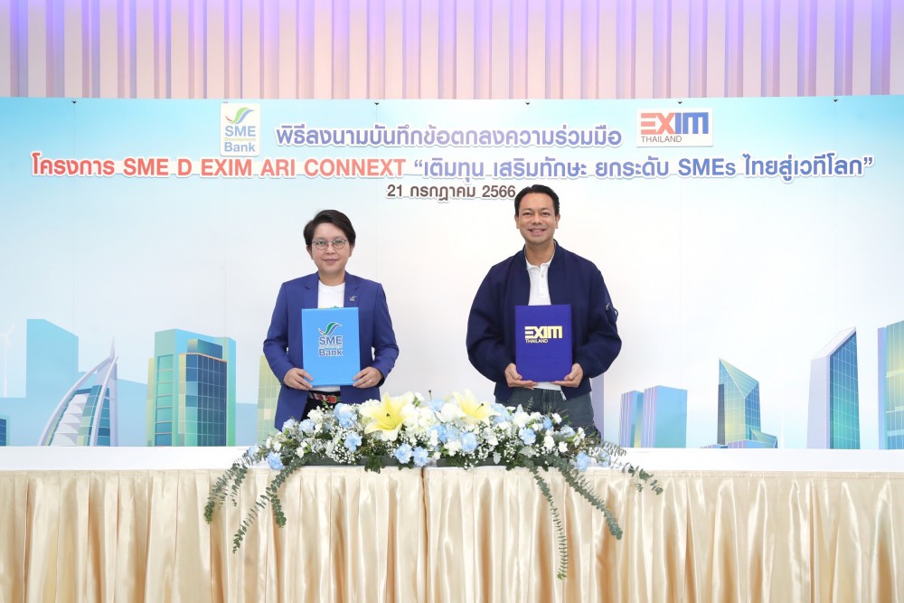 วันที่ 21 กรกฎาคม 2566 ธนาคารพัฒนาวิสาหกิจขนาดกลางและขนาดย่อมแห่งประเทศไทย (ธพว.) หรือ SME D Bank และ ธนาคารเพื่อการส่งออกและนำเข้าแห่งประเทศไทย หรือ EXIM BANK ในฐานะสถาบันการเงินเฉพาะกิจของรัฐ ภายใต้การกำกับดูแลของกระทรวงการคลัง ร่วมลงนามบันทึกข้อตกลงความร่วมมือ (MOU) “การส่งเสริมแหล่งทุนและพัฒนาศักยภาพผู้ประกอบการ SMEs สู่การค้าระหว่างประเทศให้เติบโตอย่างยั่งยืน” (โครงการ “SME D EXIM ARI CONNEXT” เติมทุน เสริมทักษะ ยกระดับ SMEs ไทย สู่เวทีโลก) โดยทั้ง 2 หน่วยงานจะร่วมกันขับเคลื่อนและสนับสนุนผู้ประกอบการ SMEs ไทย ผ่านการเชื่อมโยงข้อมูลระหว่างกัน และส่งเสริมผู้ประกอบการ SMEs เข้าถึงบริการด้านการเงิน ผ่านผลิตภัณฑ์สินเชื่อหรือร่วมลงทุน ควบคู่ด้านการพัฒนา ช่วยเพิ่มศักยภาพธุรกิจ ยกระดับขีดความสามารถการแข่งขัน ผลักดันกิจการ ทั้งในประเทศและต่างประเทศ สู่การเติบโตอย่างยั่งยืน