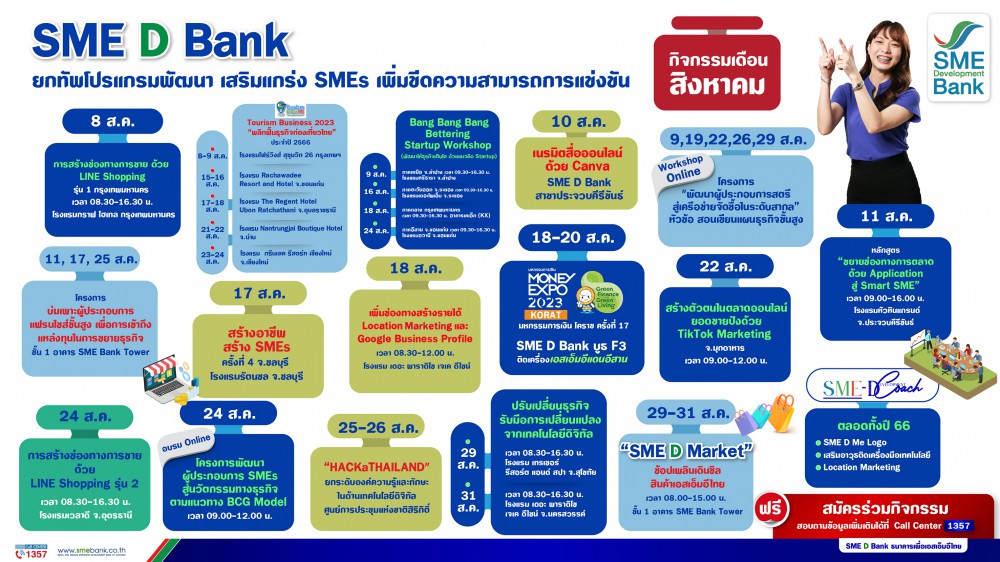 สำหรับโปรแกรม ให้บริการ ฟรี! ของ SME D Bank ตลอดเดือนสิงหาคม 2566 มีทั้งอบรม ,จัดหลักสูตร ,จัดกิจกรรม ,เนรมิตสื่อออนไลน์ด้วย Canva แพลตฟอร์มออกแบบกราฟิกที่ใช้