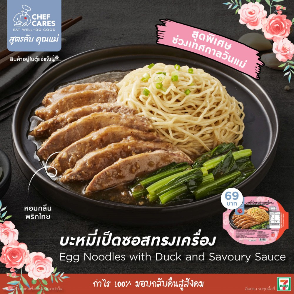 เชฟแคร์ส (Chef Cares) เอาใจแม่-ลูก คู่ผูกพัน ช่วงเทศกาลวันแม่ 2566 ด้วยเมนูเฉพาะกิจ ‘บะหมี่เป็ดซอสทรงเครื่อง‘ สูตรลับของคุณหญิงเทวี เจียรวนนท์ เมนูประจำบ้านเจียรวนนท์ที่คนในครอบครัวชื่นชอบ ด้วยความพิถีพิถันและสูตรที่เป็นเอกลักษณ์ เชฟแคร์ส จึงขอเป็นส่วนหนึ่งในการส่งมอบความอร่อยผ่านวันสำคัญครั้งนี้ ด้วยอาหารแช่แข็ง Limited Edition โดยกำไรทั้ง 100% ร่วมตอบแทนสังคมผ่านมูลนิธิเชฟแคร์สเช่นเคย วางจำหน่ายแล้ววันนี้ ในราคา เพียง 69 บาทที่ร้านสะดวกซื้อ 7-Eleven ทุกสาขาทั่วไทย