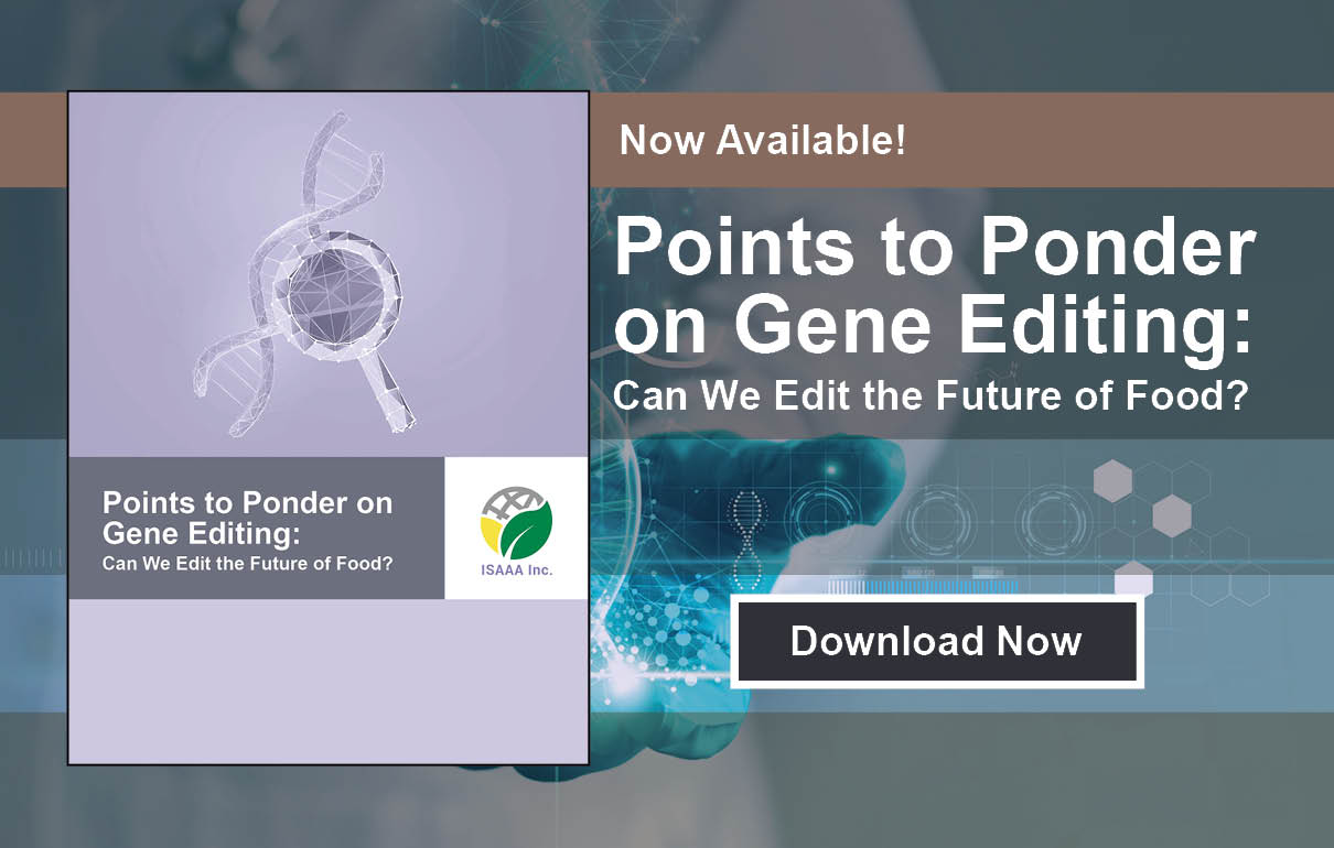 ในเอกสารเผยแพร่ฉบับใหม่ของ ISAAA ที่มีชื่อว่า Points to Ponder on Gene Editing: Can We Edit the Future of Food? (จุดที่ควรพิจารณาเกี่ยวกับการแก้ไขยีน: เราสามารถแก้ไขอาหารเพื่ออนาคตได้หรือไม่) โดยกลุ่มผู้เชี่ยวชาญจากทั่วโลกได้หารือเกี่ยวกับผลกระทบที่อาจเกิดขึ้นจากการแก้ไขยีนในบริบทของความมั่นคงทางอาหาร