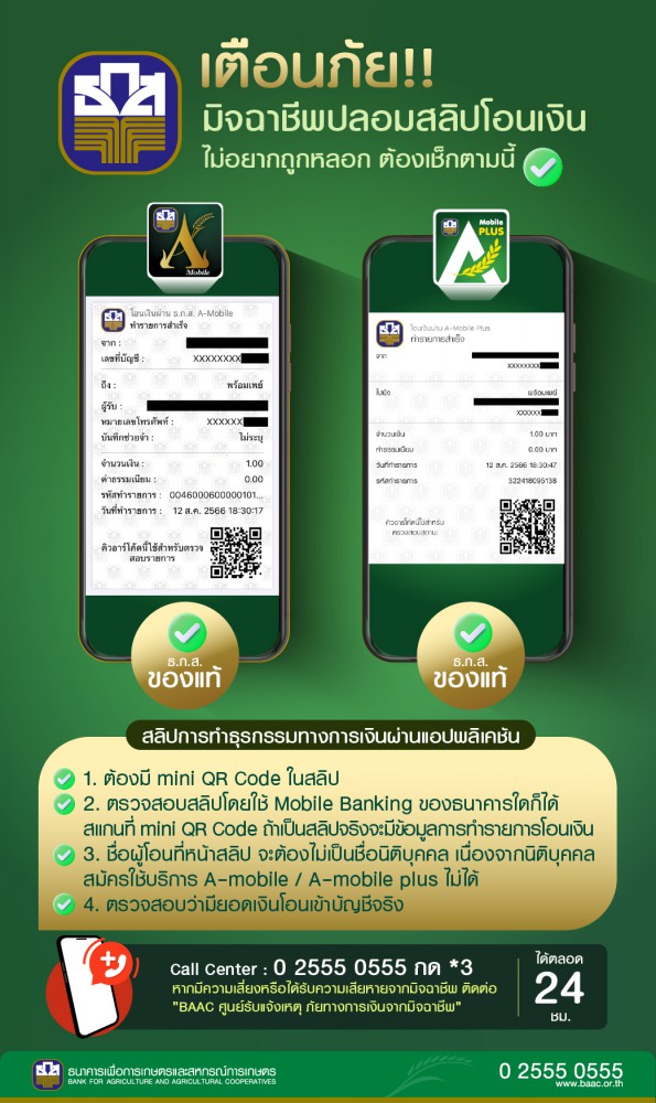 ธ.ก.ส. เตือน ! ระวังมิจฉาชีพปลอมแปลงสลิปโอนเงินโดยใช้รูปแบบ e-Slip ของธนาคารหลอกลวงชำระค่าสินค้าและบริการ แนะวิธีการตรวจสอบ e-Slip แบบง่าย ๆ เพียงสังเกตสลิปที่ได้จากแอปพลิเคชัน A-Mobile Plus หรือ ธ.ก.ส. A-Mobile ต้องมี mini QR code ในสลิปที่สามารถสแกนตรวจสอบรายการโอนเงินเพื่อเช็คชื่อบัญชีผู้โอนเงินบนหน้าสลิป ซึ่งผู้โอนต้องไม่เป็นชื่อนิติบุคคล ชี้ข้อควรคำนึงต้องอย่าลืมตรวจสอบรายการเงินเข้าบัญชีและยอดเงินจริงจากแอปพลิเคชัน Mobile banking กรณีพบความเสี่ยงจากมิจฉาชีพ ติดต่อ BAAC ศูนย์รับแจ้งเหตุภัยทางการเงินจากมิจฉาชีพ Call Center : 02 555 0555 กด *3 ได้ตลอด 24 ชม.