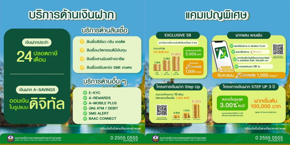 ธ.ก.ส. จัดโปรโมชันเงินฝากพิเศษ ในแคมเปญ Exclusive 58 รับผลตอบแทนเงินฝากแบบขั้นบันได สูงสุด 15.80% ต่อปี แคมเปญ Step Up ฝากเงิน 10 เดือน รับดอกเบี้ยสูงสุดกว่า 6.20% ต่อปี แคมเปญฝากแสน แถมพันกับบัญชี A-Saving และร่วมลุ้นรางวัลกับสลากออมทรัพย์ ชุดมั่งมีทวีโชค ออม 100 ลุ้น 10 ล้าน พร้อมบริการสินเชื่ออัตราดอกเบี้ยพิเศษหนุนธุรกิจที่เป็นมิตรกับสิ่งแวดล้อม ทั้งสินเชื่อ BCG สินเชื่อแทนคุณ สินเชื่อเสริมแกร่ง SME เกษตร และการให้คำปรึกษาด้านการเงิน ชวนร่วมสนุกกับกิจกรรมภายในบูธ รับของที่ระลึกมากมาย และ ชอปสินค้าคุณภาพดีจากเกษตรกรและชุมชนมาตรฐาน A-Product ได้ที่บูธ ธ.ก.ส. ในงาน Thailand Smart Money สุราษฎร์ธานี ระหว่างวันที่ 25 – 27 สิงหาคมนี้ ณ ศูนย์การค้าเซ็นทรัล สุราษฎร์ธานี