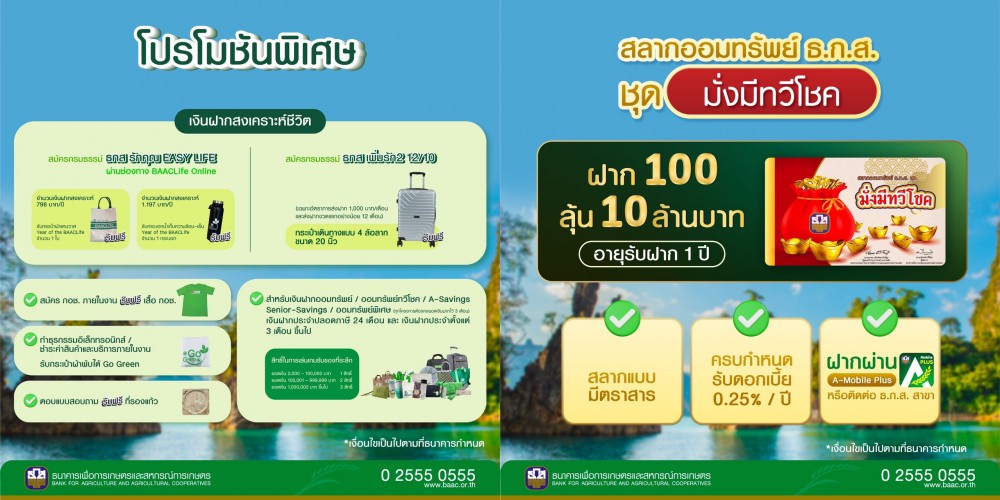 ด้านผลิตภัณฑ์เงินฝากสงเคราะห์ชีวิต ธ.ก.ส. มุ่งส่งเสริมการสร้างภูมิคุ้มกันทางการเงินและการออมแบบยั่งยืนด้วยเงินฝากสงเคราะห์ชีวิต พิเศษเฉพาะในงาน! เมื่อสมัครกรมธรรม์ ธกส เพิ่มรัก2 12/10 รับทันที กระเป๋าเดินทางล้อลากขนาด 20 นิ้ว หรือสมัครกรมธรรม์ ธกส รักคุณ Easy Life ผ่านแอปพลิเคชัน BAACLife Online รับกระเป๋าผ้าแคนวาส หรือกระบอกน้ำเก็บความร้อน – เย็น โดยลูกค้าที่สมัครกรมธรรม์เงินฝากสงเคราะห์ชีวิต ทุกประเภท ได้รับสิทธิลุ้นรับทองคำในแคมเปญปลูกรัก รับโชค น้ำหนักกว่า 90 บาท มูลค่ากว่า 2.9 ล้านบาท 1 สิทธิ์/กรมธรรม์ ระยะเวลาตั้งแต่วันนี้จนถึง 15 ตุลาคม 2566
