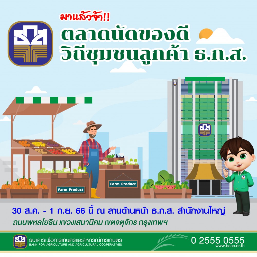 ธ.ก.ส. ชวนชม ชิม ช้อป สินค้าเกษตรและผลิตภัณฑ์คุณภาพจากเกษตรกรลูกค้ากว่า 50 ร้านค้าในงานตลาดนัดของดีวิถีชุมชน ทั้งผักผลไม้ตามฤดูกาล อาหารพร้อมทาน เครื่องแต่งกาย และสินค้าแปรรูปที่ส่งตรงจากแหล่งผลิตมาให้เลือกซื้อ ณ บริเวณด้านหน้า ธ.ก.ส. สำนักงานใหญ่ กรุงเทพมหานคร ระหว่างวันที่ 30 สิงหาคม – 1 ก.ย. 66 นี้