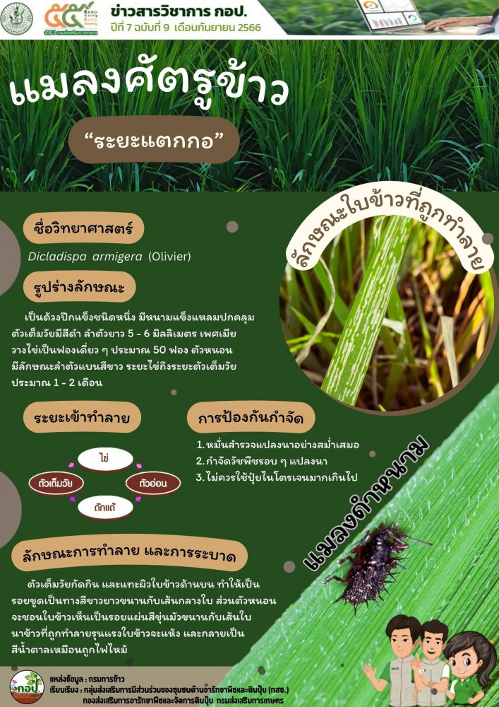 สำหรับแมลงดำหนาม เป็นศัตรูข้าวที่มักจะกัดกินเนื้อเยื่อส่วนสีเขียวบริเวณใบข้าวทั้งที่เป็นระยะตัวหนอนและตัวเต็มวัย มีวงจรชีวิตรวม 1 – 2 เดือน โดยตัวหนอนจะชอนใบจนเห็นเป็นรอยแผ่นขุ่นขาวขนานกับเส้นทางใบ และตัวเต็มวัยจะแทะผิวใบเป็นรอยขูดขาวขนานตามทางใบคล้ายคลึงกัน ทำให้ใบข้าวเสียหาย หากถูกทำลายรุนแรงเป็นจำนวนมาก ใบข้าวจะแห้งเป็นสีน้ำตาลเหมือนรอยไฟไหม้ ทำให้ผลผลิตลดลง วิธีการสังเกต ให้สำรวจบริเวณกอข้าว แมลงดำหนามข้าวตัวเต็มวัย จะมีปีกแข็งสีดำและมีหนามแข็งแหลมปกคลุมลำตัว ความยาวประมาณ 5 – 6 มิลลิเมตร ตัวเมียชอบวางไข่บริเวณปลายใบข้าวอ่อน ซึ่งตัวเต็มวัยนี้จะมีอายุประมาณ 14 – 21 วัน วางไข่ได้ประมาณ 50 ฟอง ส่วนตัวหนอนที่ฟักออกจากไข่แล้ว มีลำตัวแบนสีขาว สามารถกัดกินเนื้อเยื่อภายในผิวใบข้าวสร้างความเสียหายต่อไปได้
