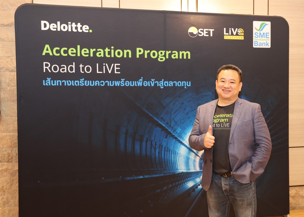 สำหรับโครงการ “Acceleration Program Road to LiVE เส้นทางเตรียมความพร้อมเพื่อเข้าสู่ตลาดทุน” เป็นความร่วมมือระหว่าง SME D Bank กับ บริษัท ดีลอยท์ ทู้ช โธมัทสุ ไชยยศ สอบบัญชี จำกัด หรือ “ดีลอยท์ ไทยแลนด์” ภายใต้การสนับสนุนจากตลาดหลักทรัพย์แห่งประเทศไทย (ตลท.) หรือ SET และ LiVE Platform จัดขึ้นเพื่อสนับสนุนผู้ประกอบการเอสเอ็มอี และสตาร์ทอัพ ที่มีศักยภาพและต้องการเติบโตในตลาดทุนไทย กว่า 50 ราย ให้ได้รับการสนับสนุนพัฒนาธุรกิจ ตลอดจน คำแนะนำจากผู้เชี่ยวชาญหลากหลายสาขา เพื่อต่อยอดสร้างเครือข่ายธุรกิจ และสามารถก้าวสู่ตลาดทุนไทยได้ต่อไปในอนาคต จัด ณ โรงแรมคอนราด กรุงเทพ เมื่อเร็วๆ นี้