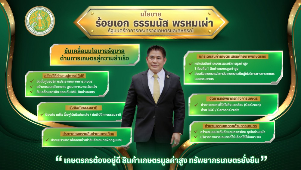 “ผมมีความภาคภูมิใจ ที่ได้กลับมาทำงาน และรับใช้พี่น้องเกษตรกรอีกครั้ง ซึ่งแนวทางการทำงาน และนโยบายของกระทรวงเกษตรและสหกรณ์ที่ผมจะขับเคลื่อนและผลักดันนั้น จะไม่ใช่มีเพียงนโยบายที่กล่าวไปข้างต้น ยังมีอีกหลายนโยบายและแนวทางปฏิบัติต่างๆ ที่จะครอบคลุม เพื่อช่วยเหลือ ช่วยแก้ปัญหาพี่น้องเกษตรกร และพัฒนาภาคเกษตร ซึ่งทุกนโยบายและทุกการทำงานจะเป็นไปอย่างจริงจัง เกิดผลเป็นรูปธรรมชัดเจน และต้องเกิดจากความร่วมมือร่วมใจทำงานอย่างบูรณาการทีมเวิร์ค แบบครอบครัวไปด้วยกัน เพื่อพี่น้องเกษตรกรกินดี อยู่ดี มีรายได้ มีอาชีพที่มั่นคง สินค้าเกษตรมูลค่าสูง ทรัพยากรเกษตรยั่งยืน และภาคเกษตรไทยคือผู้นำสินค้าเกษตรในตลาดโลก” รัฐมนตรีว่าการกระทรวงเกษตรฯ กล่าว