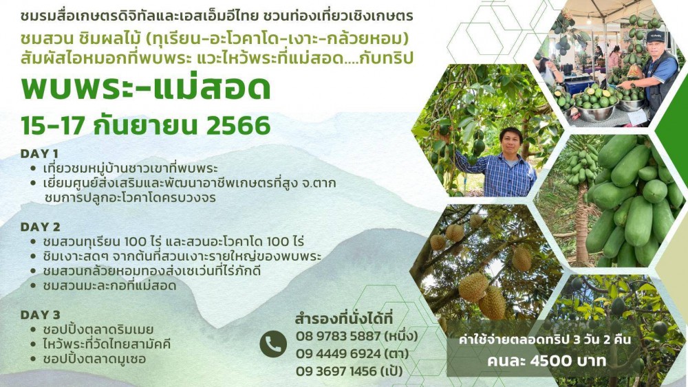 สนใจสัมผัสวิถีเกษตรยุคใหม่ที่พบพระ ชมรมสื่อเกษตรดิจิทัลจัดโครงการเกษตรทัศนศึกษาที่ อ.พบพระ เรียนรู้การปลูก ขยายพันธุ์อะโวคาโดเพื่อการค้า ชิมทุเรียนพบพระ ชมการปลูกมะกอทำเงินล้าน กล้วยหอมทอง และไปกินเงาะถึงในสวน ระหว่างวันที่ 15-17 กันยายน 2566 สอบถามได้ที่ 0897835887(หนึ่ง) 0936971456(เป้)