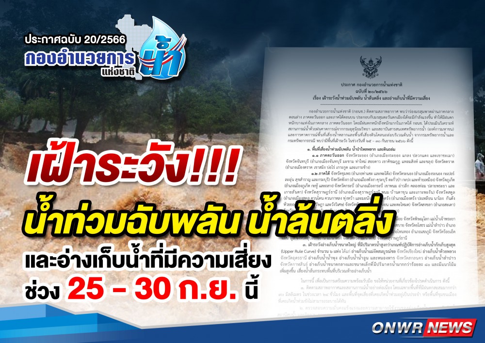 กองอำนวยการน้ำแห่งชาติ ออกประกาศฉบับที่ 20/2566 ให้เฝ้าระวังน้ำท่วมฉับพลัน น้ำป่าไหลหลาก และดินถล่มในพื้นที่ 2 จังหวัดภาคตะวันออก 10 ภาคใต้ ขณะที่พื้นที่ลุ่มต่ำริมแม่น้ำแควน้อย แม่น้ำเจ้าพระยาระวังน้ำล้นตลิ่ง และอีก ุ6 อ่างเก็บน้ำที่มีความเสี่ยงน้ำล้น