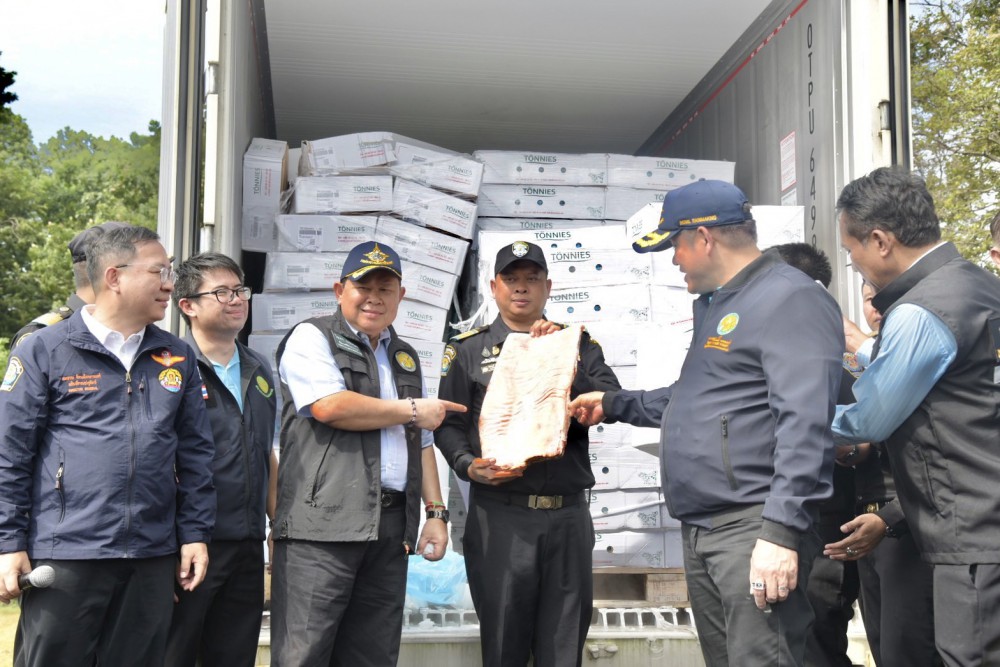 “การจับเนื้อเถื่อน เป็นนโยบายของกระทรวงเกษตรและสหกรณ์ ซึ่งการดำเนินการในวันนี้ เกิดจากความร่วมมือทุกภาคส่วน ทุกหน่วยงาน ทั้งเจ้าหน้าที่กรมปศุสัตว์ ตำรวจ กรมศุลกากร เป็นการปฏิบัติหน้าที่อย่างถูกต้อง การทุจริตคอร์รัปชั่น การลักลอบนำเข้าทั้งเนื้อไก่ ขาไก่ เนื้อสุกร เนื้อโค เนื้อกระบือ เป็นการบ่อนทำลายเสถียรภาพด้านราคา มาตรฐาน คุณภาพ สุขภาพร่างกายของผู้บริโภค หากตรวจพบให้จับอย่างเดียวและดำเนินคดีให้ถึงที่สุด ไม่ต้องมาเคลียร์ จะไม่ยอมให้มีการกระทำผิดเกิดขึ้นอย่างเด็ดขาด” ร้อยเอก ธรรมนัส กล่าว