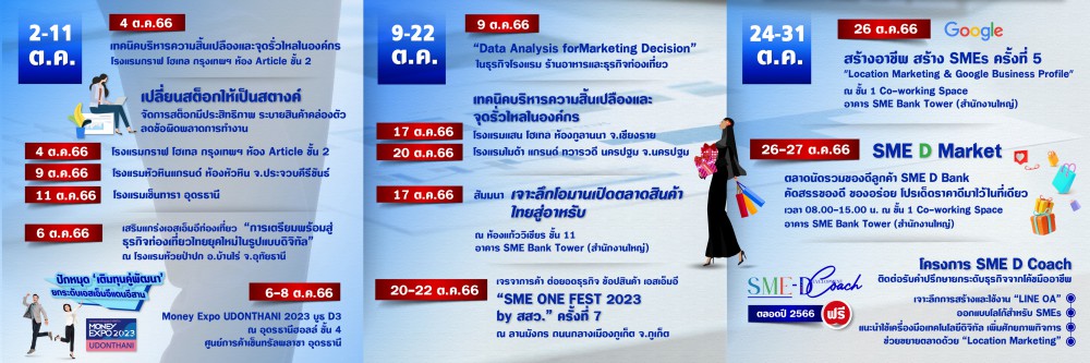 9. “SME D Market” ตลาดนัดรวมของดีเอสเอ็มอีไทย คัดสรรของดี โปรเด็ดราคาดีมาไว้ในที่เดียว จัดวันที่ 26-27 ต.ค.66 เวลา 08.00-15.00 น. ณ ชั้น 1 Co-working Space อาคาร SME Bank Tower (สำนักงานใหญ่)