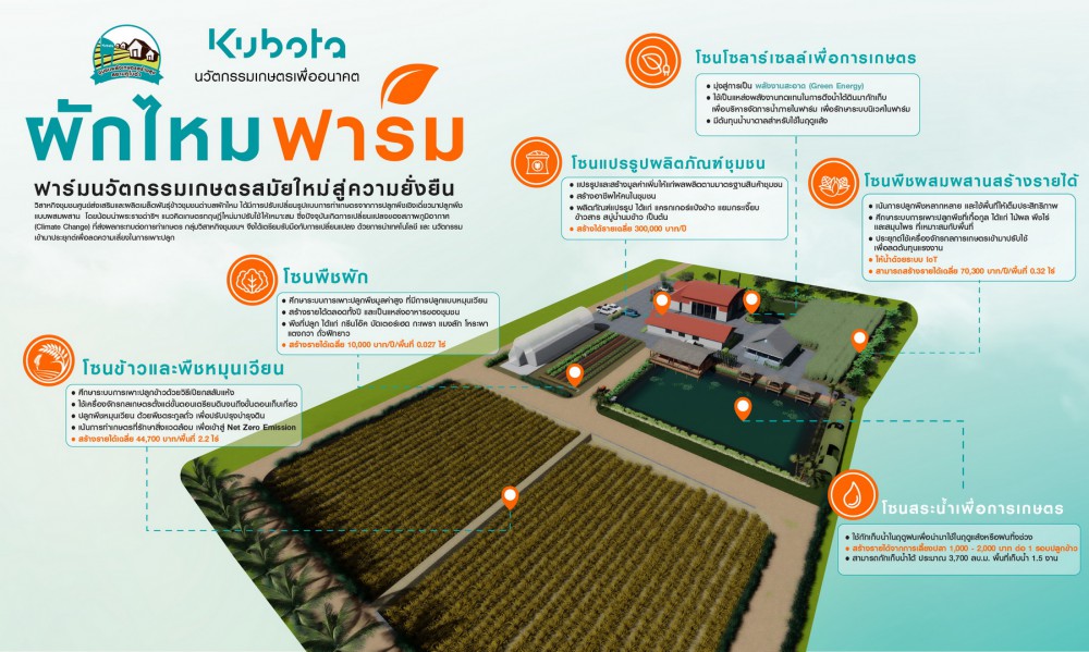 4. โซนพืชผสมผสานสร้างรายได้ เน้นการปลูกพืชหลากหลาย และใช้พื้นที่ให้เต็มประสิทธิภาพ โดยทำการศึกษาระบบการเพาะปลูกพืชที่เกื้อกูล ได้แก่ ไม้ผล พืชไร่ และสมุนไพร ที่เหมาะสมกับพื้นที่ มีการให้น้ำด้วยระบบ IoT และนำเครื่องจักรกลเกษตรคูโบต้าเข้ามาปรับใช้เพื่อลดต้นทุนแรงงาน สามารถสร้างรายได้เฉลี่ย 70,300 บาท/ ปี