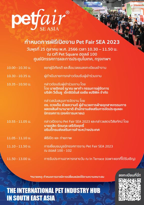 พิธีเปิดงาน วันพุธที่ 25 ตุลาคม 2566 เวลา 10:30 – 11.50 น. ณ เวที Pet Square ฮอลล์ 100-102 ศูนย์ประชุมและนิทรรศการไบเทค ซึ่งการจัดงานในครั้งนี้ ครอบคลุมพื้นที่แสดงสินค้ากว่า 17,000 ตรม. เต็มพื้นที่ 3 ฮอลล์แสดงสินค้า โดยมีผู้ประกอบการเข้าร่วมแสดงงานจำนวน 270 บริษัท และมีสัดส่วนผู้แสดงสินค้าจากประเทศในอาเซียน 39%, เอเชียตะวันออก 33%, ยุโรป 15%, อเมริกาเหนือ 8%, เอเชียใต้ 5% และโอเชียเนีย 1%
