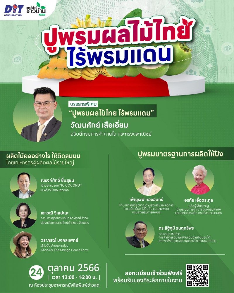 เทคโนโลยีชาวบ้าน จับมือกรมการค้าภายใน จัดใหญ่ สัมมนาแห่งปี!! “ปูพรมผลไม้ไทย ไร้พรมแดน” หวังแนะแนวทางเปิดเส้นทางตลาดผลไม้ พิชิตช่องทางการส่งออกให้กับเกษตรกร ผู้ประกอบการธุรกิจเกษตร วันที่ 24 ตุลาคม 2566 ผู้สนใจเข้าร่วมฟังสัมมนาฟรี