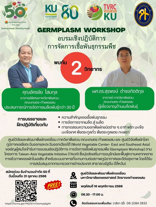 ศูนย์วิจัยและพัฒนาพืชผักเขตร้อน ภาควิชาพืชสวน คณะเกษตรกำแพงแสน มหาวิทยาลัยเกษตรศาสตร์ร่วมกับศูนย์วิจัยพืชผักโลกภูมิภาคเอเชียตะวันออกและตะวันออกเฉียงใต้ (World Vegetable Center- East and Southeast Asia) จัดอบรมเชิงปฏิบัติการเรื่อง การจัดการเชื้อพันธุกรรมพืช (Germplasm Workshop) ตามโครงการ Taiwan- Asia Vegetable Initiative หรือ TAsVI