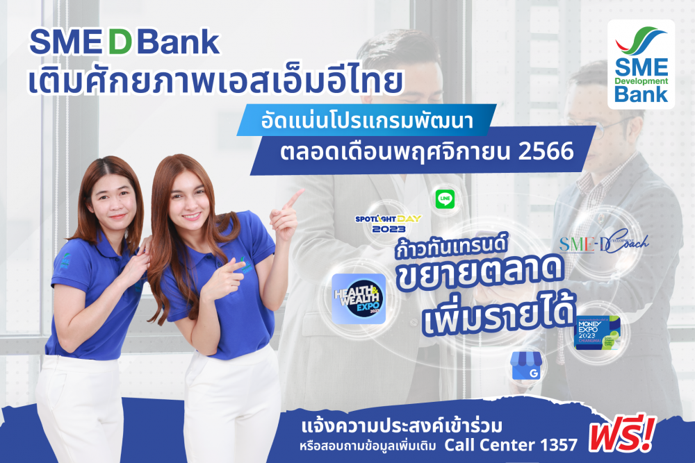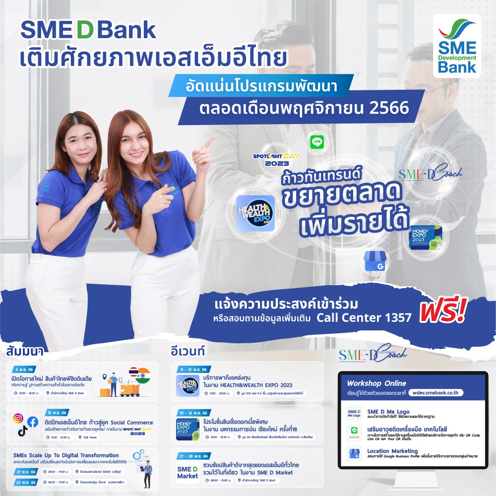 ธนาคารพัฒนาวิสาหกิจขนาดกลางและขนาดย่อมแห่งประเทศไทย (ธพว.) หรือ SME D Bank เดินหน้าภารกิจธนาคารเพื่อการพัฒนา จัดโปรแกรมเติมความรู้ ส่งเสริมการตลาด ตลอดเดือนพฤศจิกายน 2566 ช่วยผู้ประกอบการเอสเอ็มอีไทยเพิ่มขีดความสามารถ ยกระดับธุรกิจ ปรับตัวทันยุค ตลาดเติบโต เพิ่มรายได้ ก้าวสู่ความสำเร็จอย่างยั่งยืน ทุกโปรแกรมเข้าร่วมได้ฟรี สมัครร่วมกิจกรรมหรือสอบถามข้อมูลเพิ่มเติม Call CENTER 1357