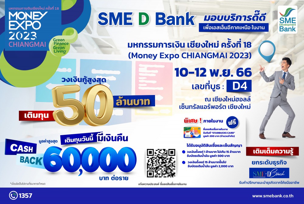 ธนาคารพัฒนาวิสาหกิจขนาดกลางและขนาดย่อมแห่งประเทศไทย (ธพว.) หรือ SME D Bank จัดโปรโมชั่นหนุนเอสเอ็มอี ร่วมงาน “มหกรรมการเงิน เชียงใหม่ ครั้งที่ 18” หรือ Money Expo CHIANGMAI 2023 ระหว่างวันที่ 10-12 พฤศจิกายน 2566 ที่หมายเลขบูธ D4 เชียงใหม่ฮอลล์ เซ็นทรัลแอร์พอร์ต เชียงใหม่ ยกขบวน “เติมทุนคู่พัฒนา” ด้าน “การเงิน” เสริมสภาพคล่อง เพิ่มขีดความสามารถการแข่งขัน