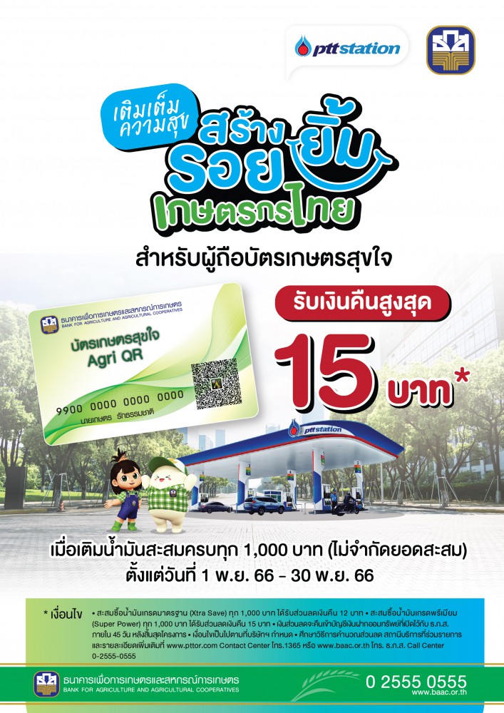 สำหรับน้ำมันใสเกรดพรีเมียม (กลุ่ม Super power) ได้แก่ น้ำมันซูปเปอร์พาวเวอร์แก๊สโซฮอล์ 95 และน้ำมันซูปเปอร์พาวเวอร์ดีเซล B7 ครบทุก 1,000 บาท รับส่วนลดทันที 15 บาท (ไม่จำกัดยอดสะสม) ระยะเวลาโปรโมชันตั้งแต่บัดนี้จนถึง 30 พฤศจิกายน 2566 (ธนาคารจะดำเนินการคืนเงินส่วนลดเข้าบัญชีเงินฝากออมทรัพย์ ธ.ก.ส. ภายใน 45 วัน หลังสิ้นสุดโปรโมชัน) เงื่อนไขเป็นไปตามที่ธนาคาร และบริษัทฯ กำหนด ศึกษารายละเอียดเพิ่มเติมได้ที่เว็บไซต์ www.baac.or.th Call Center 02 555 0555 หรือ www.pttor.com Contact Center โทร 1365