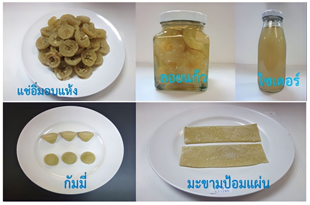 1.มะขามป้อมแช่อิ่มอบแห้ง ลักษณะเป็นสีธรรมชาติ รสชาติกลมกล่อม หวานน้อย มีอายุการเก็บรักษา ประมาณ 3-4 เดือน,2.มะขามป้อมลอยแก้ว มีความสามารถเป็นสารต้านอนุมูลอิสระ และมีปริมาณวิตามินซี มีอายุการเก็บรักษาประมาณ 3-4 เดือน ที่อุณหภูมิ 4 องศาเซลเซียส,3.มะขามป้อมแผ่น มีความสามารถเป็นสารต้านอนุมูลอิสระ และมีปริมาณวิตามินซี อายุการเก็บรักษา 3 เดือน ที่อุณหภูมิห้อง