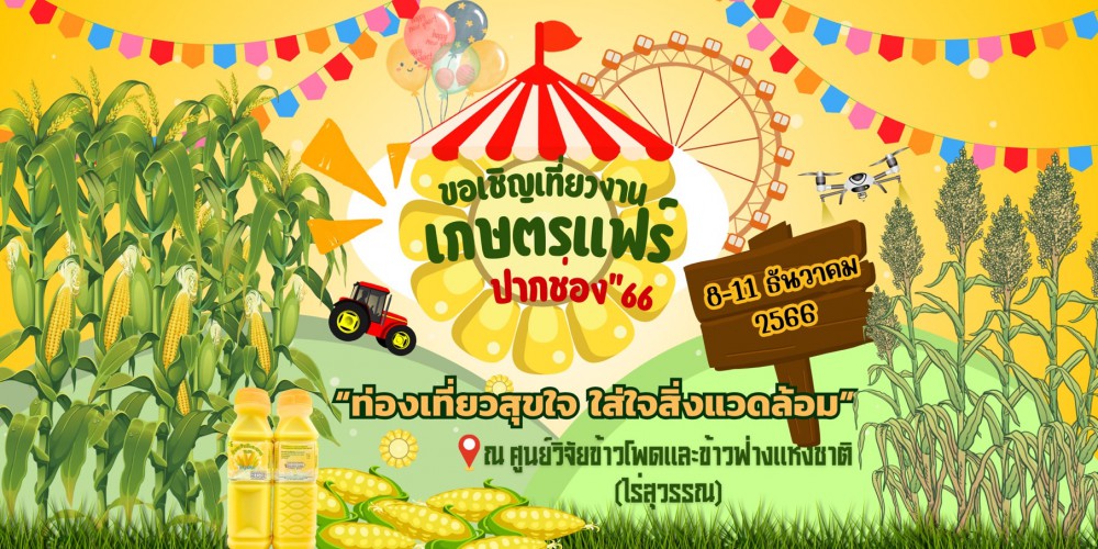 จึงขอเชิญชวนทุกท่านเข้าร่วมงานพิธีเปิด และเข้ามาเที่ยวชมนิทรรศการ นั่งรถข้าวโพดสุวรรณทัวร์ ชมแปลงสาธิตแสดงพันธุ์พืช ได้แก่ ข้าวโพด ข้าวฟ่าง และพืชเศรษฐกิจอื่นๆ จากทั้งหน่วยงานภาครัฐและเอกชน และเลือกซื้อสินค้าทางการเกษตรภายในงานได้ทุกวันตลอด 4 วัน 3 คืน ระหว่างวันที่ 8-11 ธันวาคม 2566 ณ ศูนย์วิจัยข้าวโพดและข้าวฟ่างแห่งชาติ อ.ปากช่อง จ.นครราชสีมา