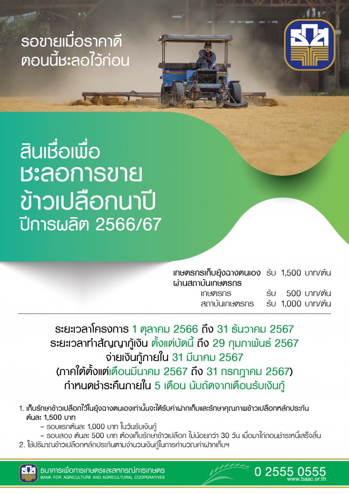 และ 2) สินเชื่อเพื่อรวบรวมข้าวและสร้างมูลค่าเพิ่มโดยสถาบันเกษตรกร ปีการผลิต 2566/67 วงเงินรวม 10,000 ล้านบาท เป้าหมายรวบรวมปริมาณข้าวเปลือก 1 ล้านตัน โดยสหกรณ์การเกษตร ชุมนุมสหกรณ์การเกษตร กลุ่มเกษตรกร วิสาหกิจชุมชนและศูนย์ข้าวชุมชนที่ประกอบธุรกิจรวบรวมข้าวจากเกษตรกรสมาชิก และเกษตรกรทั่วไป ซึ่งมีคุณสมบัติตามที่กำหนดสามารถขอสนับสนุนสินเชื่อ ดังนี้ สหกรณ์การเกษตร/ชุมนุมสหกรณ์การเกษตร แห่งละไม่เกิน 300 ล้านบาท กลุ่มเกษตรกรแห่งละไม่เกิน 20 ล้านบาท และวิสาหกิจชุมชนและศูนย์ข้าวชุมชน แห่งละไม่เกิน 5 ล้านบาท ซึ่งสถาบันฯ ชำระดอกเบี้ยเพียงร้อยละ 1 ต่อปี ส่วนที่เหลือรัฐบาลรับภาระชำระแทน ระยะเวลาจ่ายสินเชื่อตั้งแต่บัดนี้จนถึง 30 กันยายน 2567 สอบถามรายละเอียดเพิ่มเติมได้ที่ ธ.ก.ส. ทุกสาขาทั่วประเทศหรือ Call Center 02 555 0555